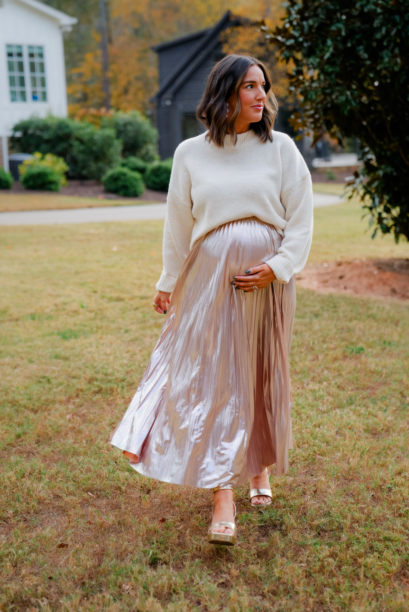 Turn heads in our Sheen Queen Metallic Pleated Midi Skirt that catches every bit of light just right. It's a look that is equal parts romantic and effortlessly glam!