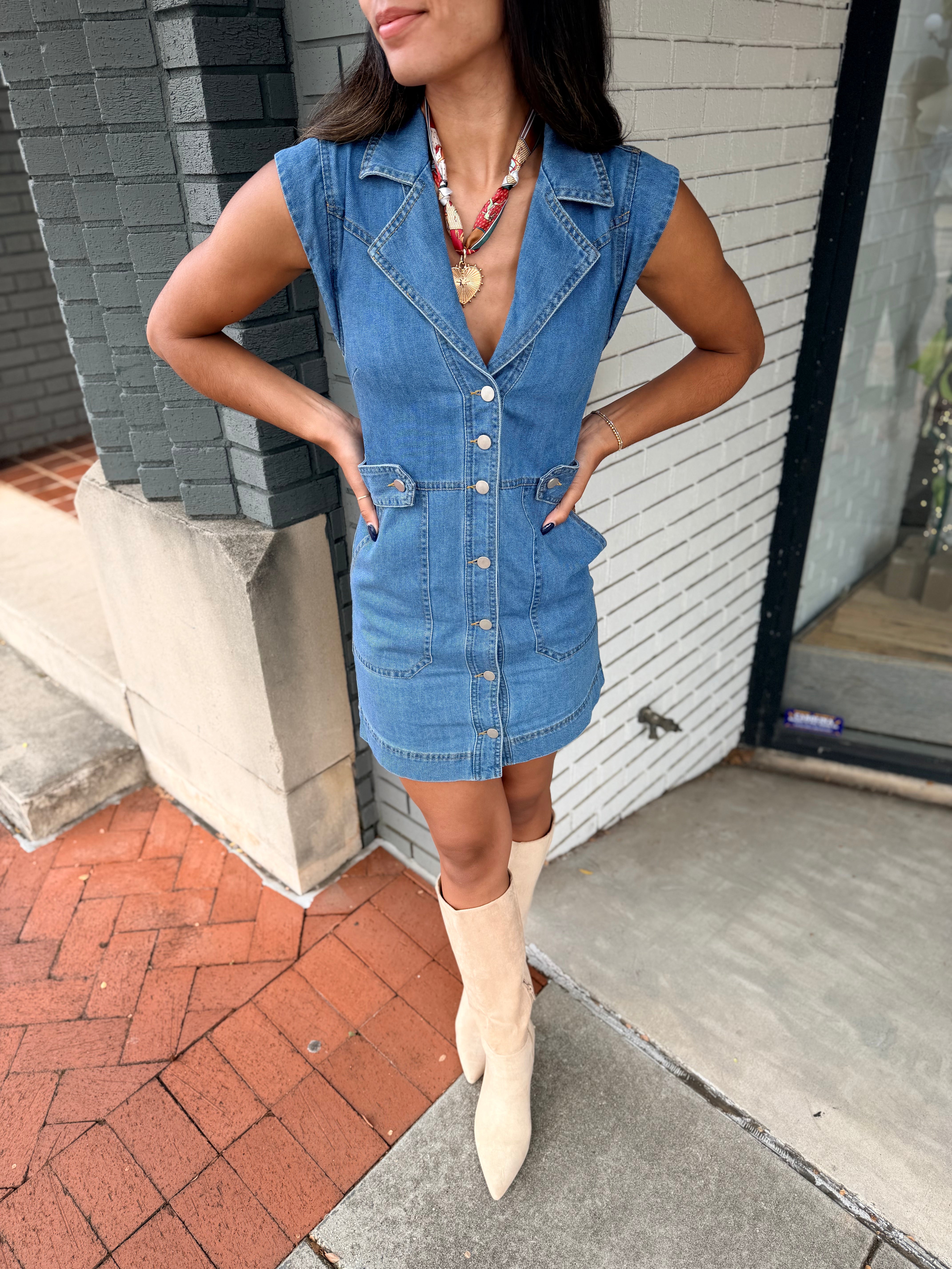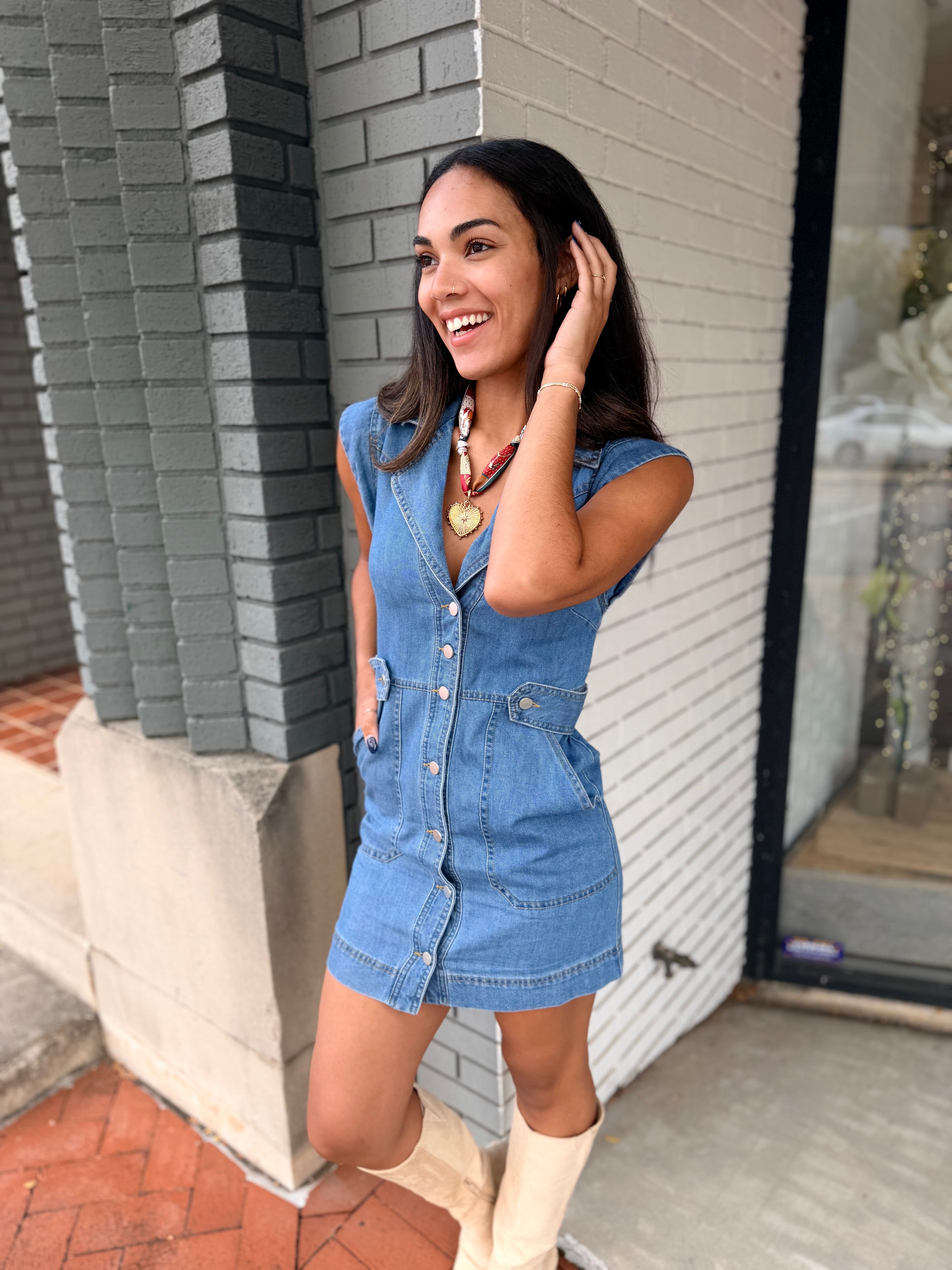 Laid back meets polished in our Karlie Denim Utility Pocket Dress. With its effortless charm and versatile style, it's the go-to piece you'll reach for season after season!