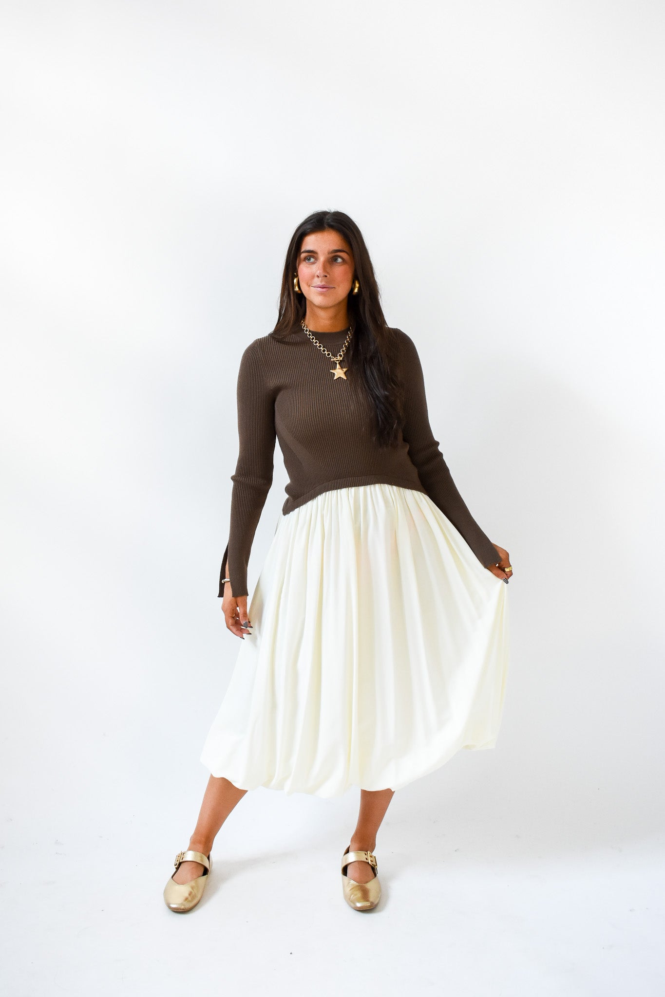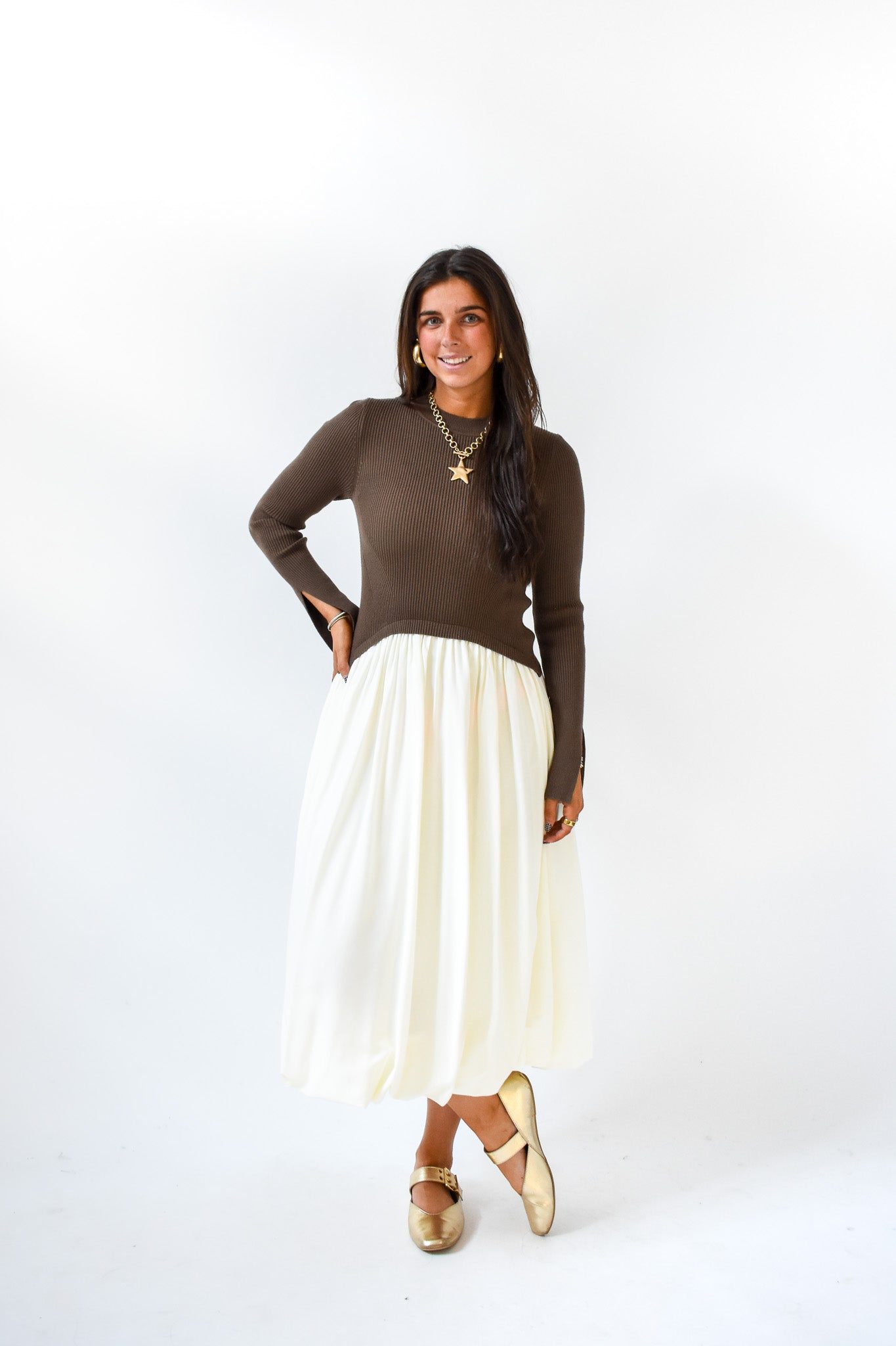 Meet the Knit Me A Latte Dress- a cozt mix of knit and woven textures in warm brown and creamy tones. It's the perfect blend of comfort and charm, ready to rake you from coffee runs to a night out.