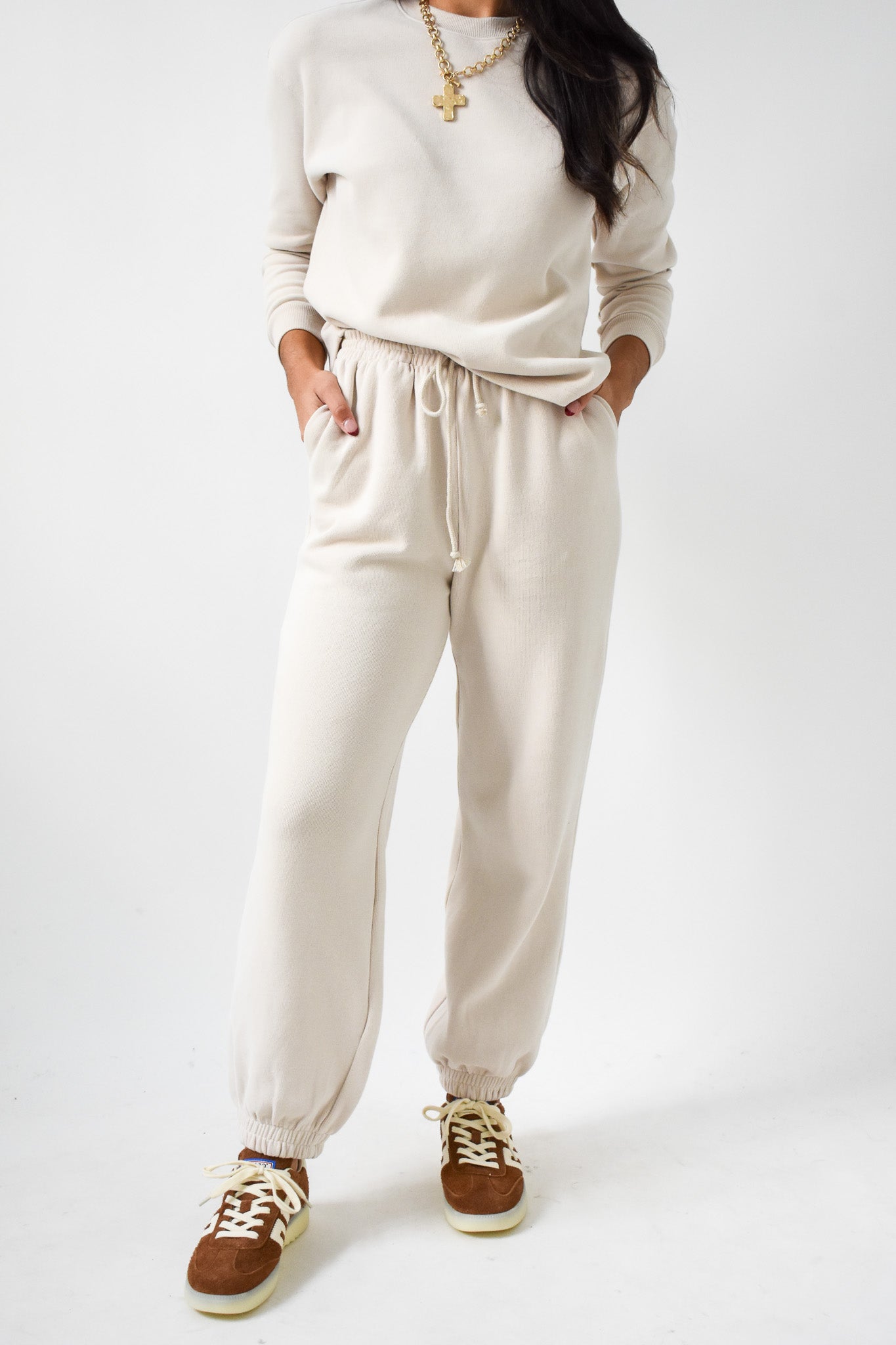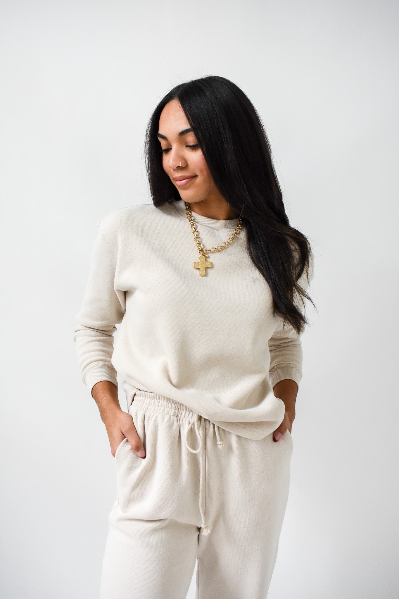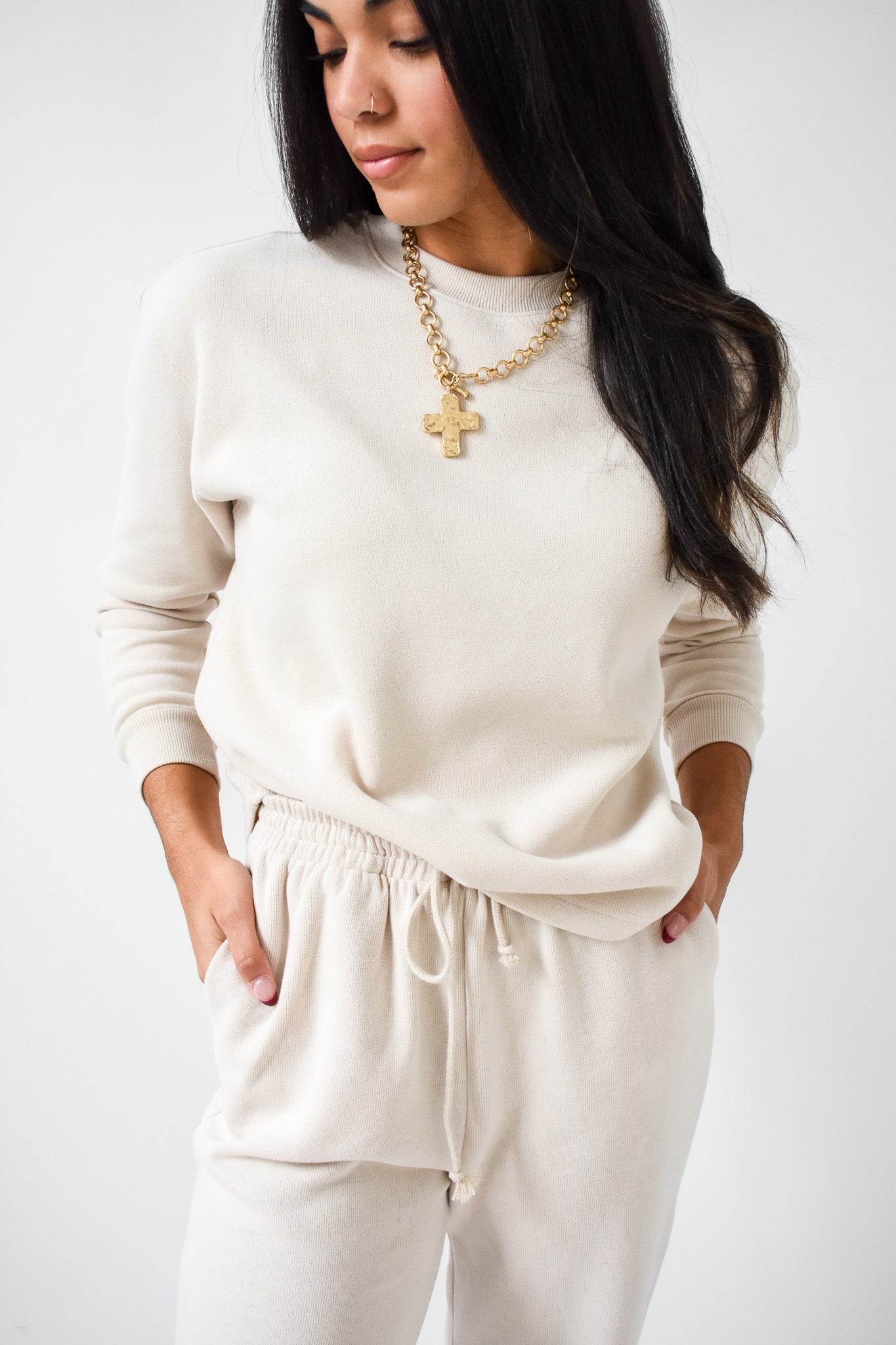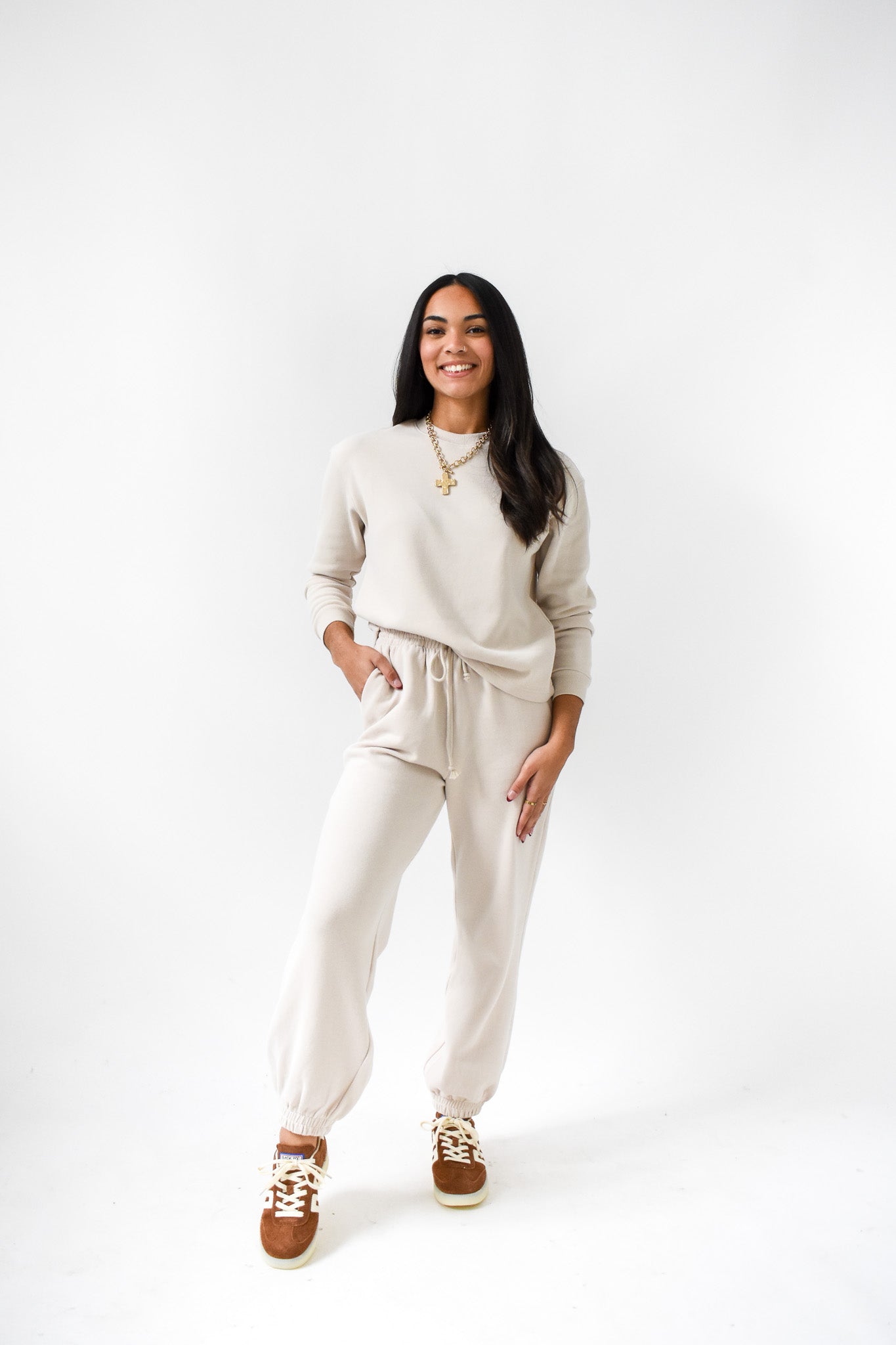 Soft, neutral, and oh-so-chic, our Lounge Goals Sweatshirt and Joggers Set is perfect for lounging or running errands in style. Comfy enough to relax in, yet polished enough to step out, it's the ultimate everyday set!