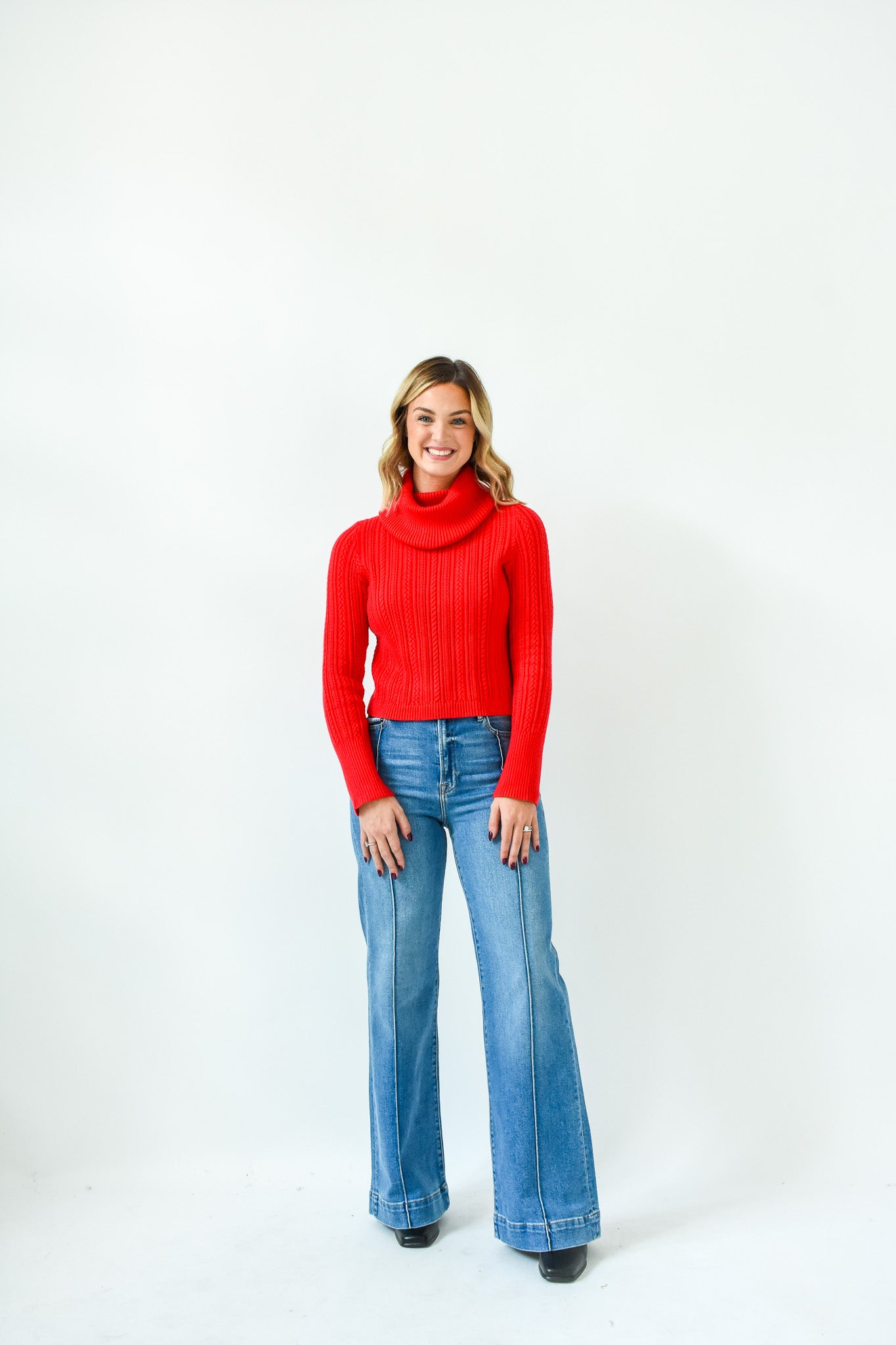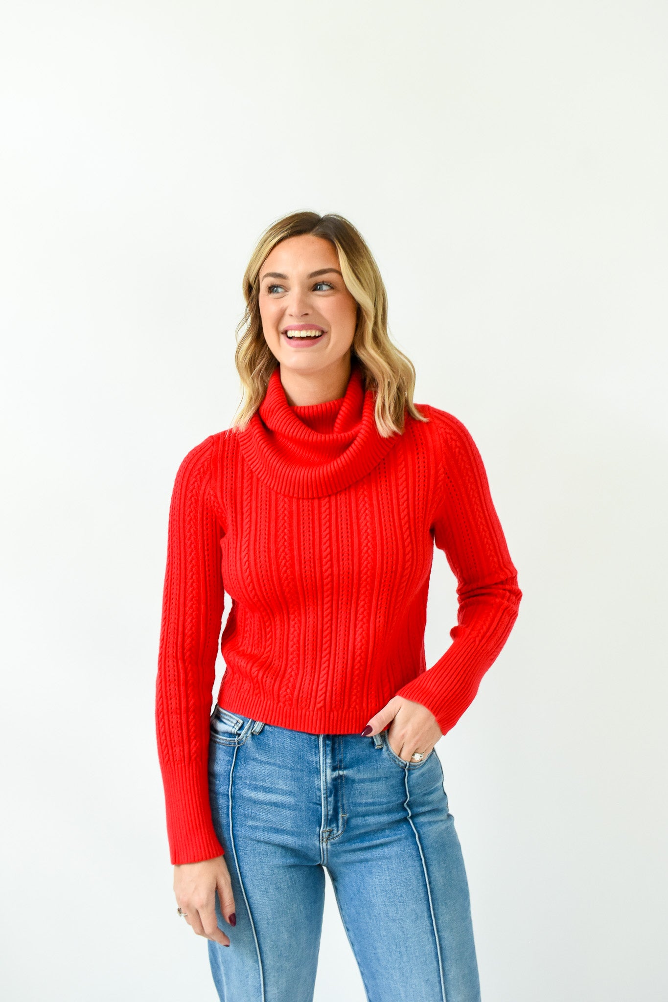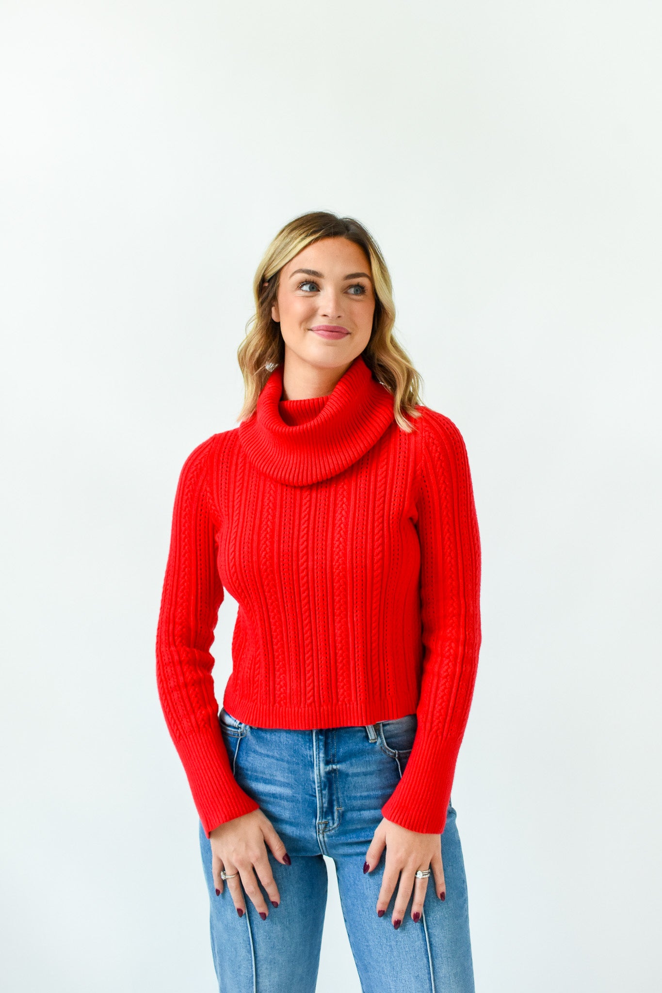 Breezy days just got a touch sweeter with our Red-y To Cuddle Turtleneck Sweater! It features a foldover turtleneck, long sleeves with ribbed cuffs, lightweight pierced pointelle shapes throughout, semi fitted bodice, and straight hem.