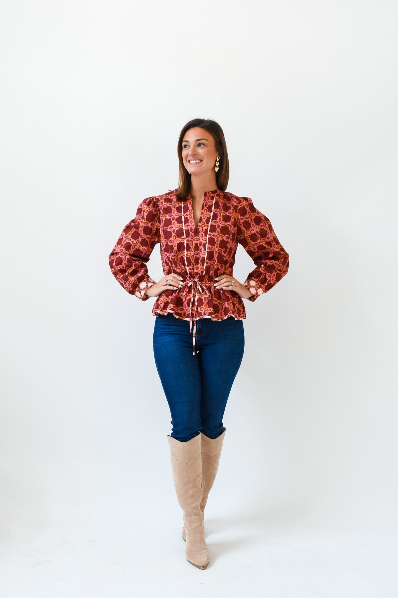 You're new favorite top is here and it's a must have- our Crimson Kaleidoscope Top will be a fall staple!