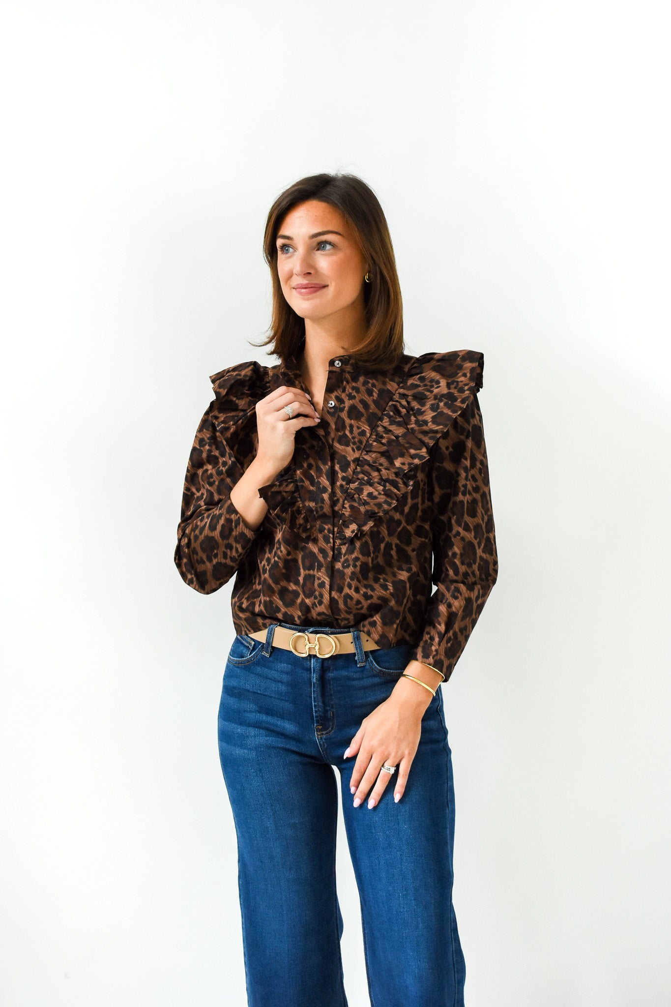Our Karlie Leopard Ruffle Button Top brings a playful twist to a classic button up with flirty ruffles and a bold leopard print. Pair it with denim or dress it up - this top is made to make a statement!