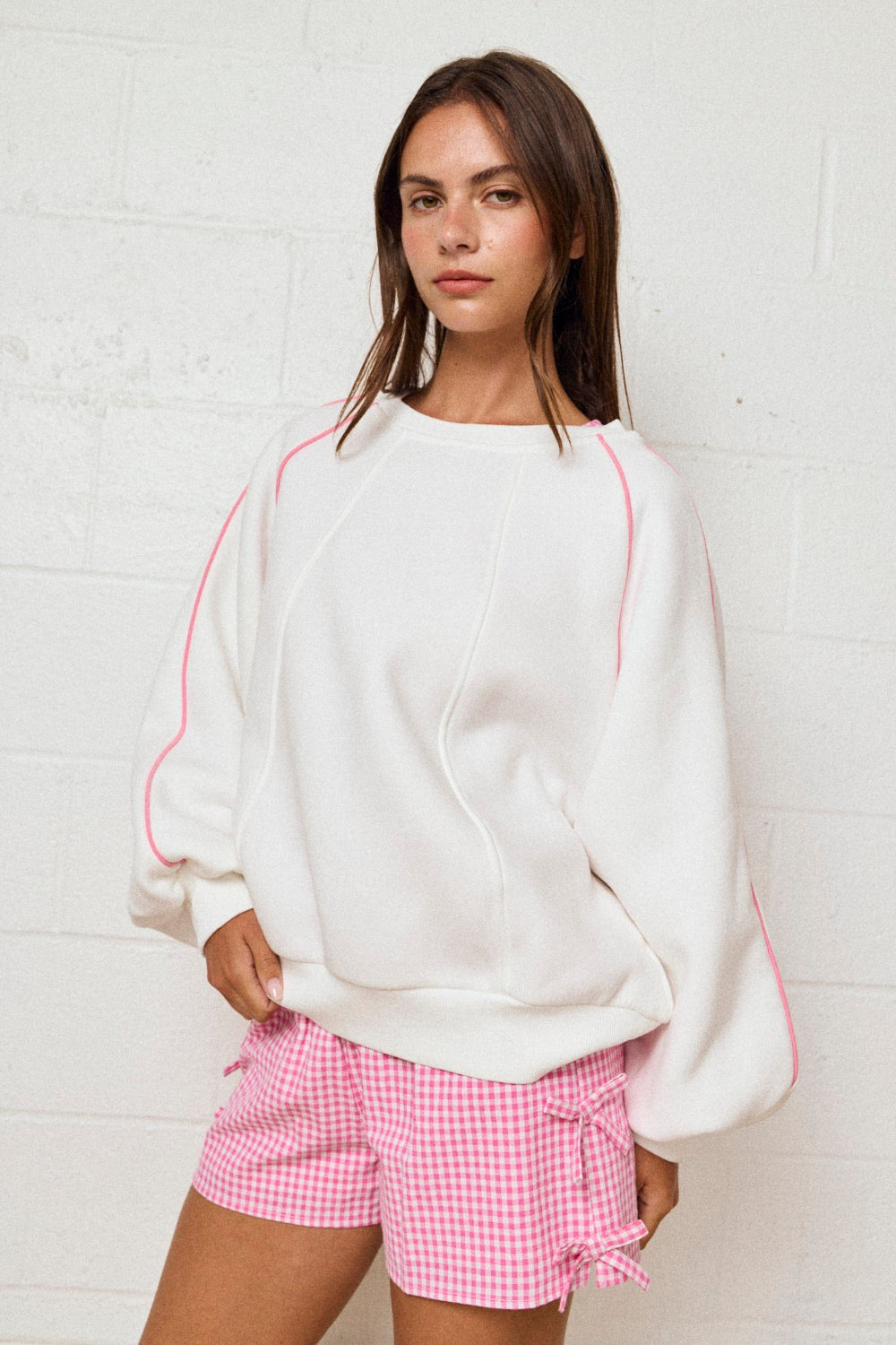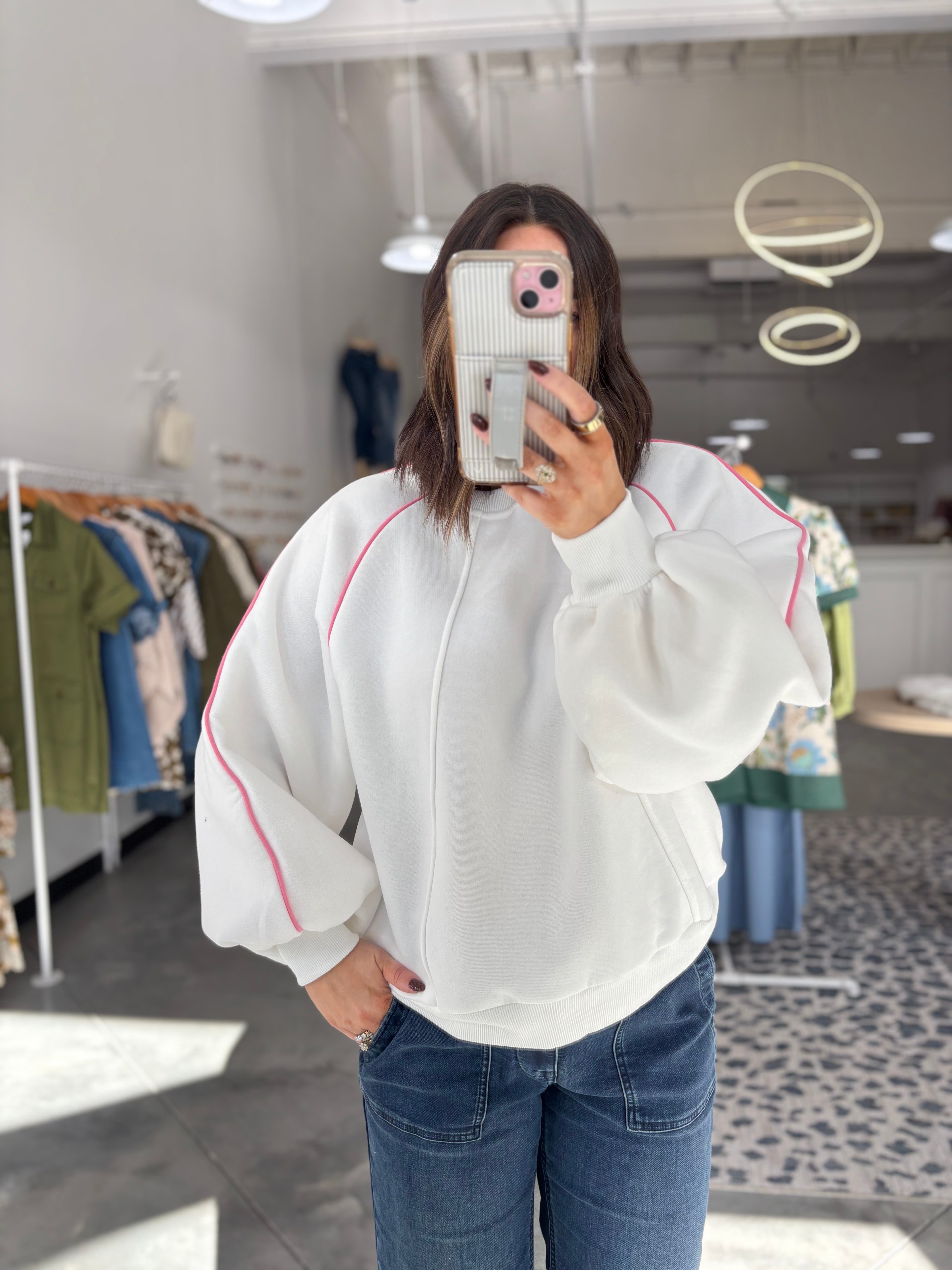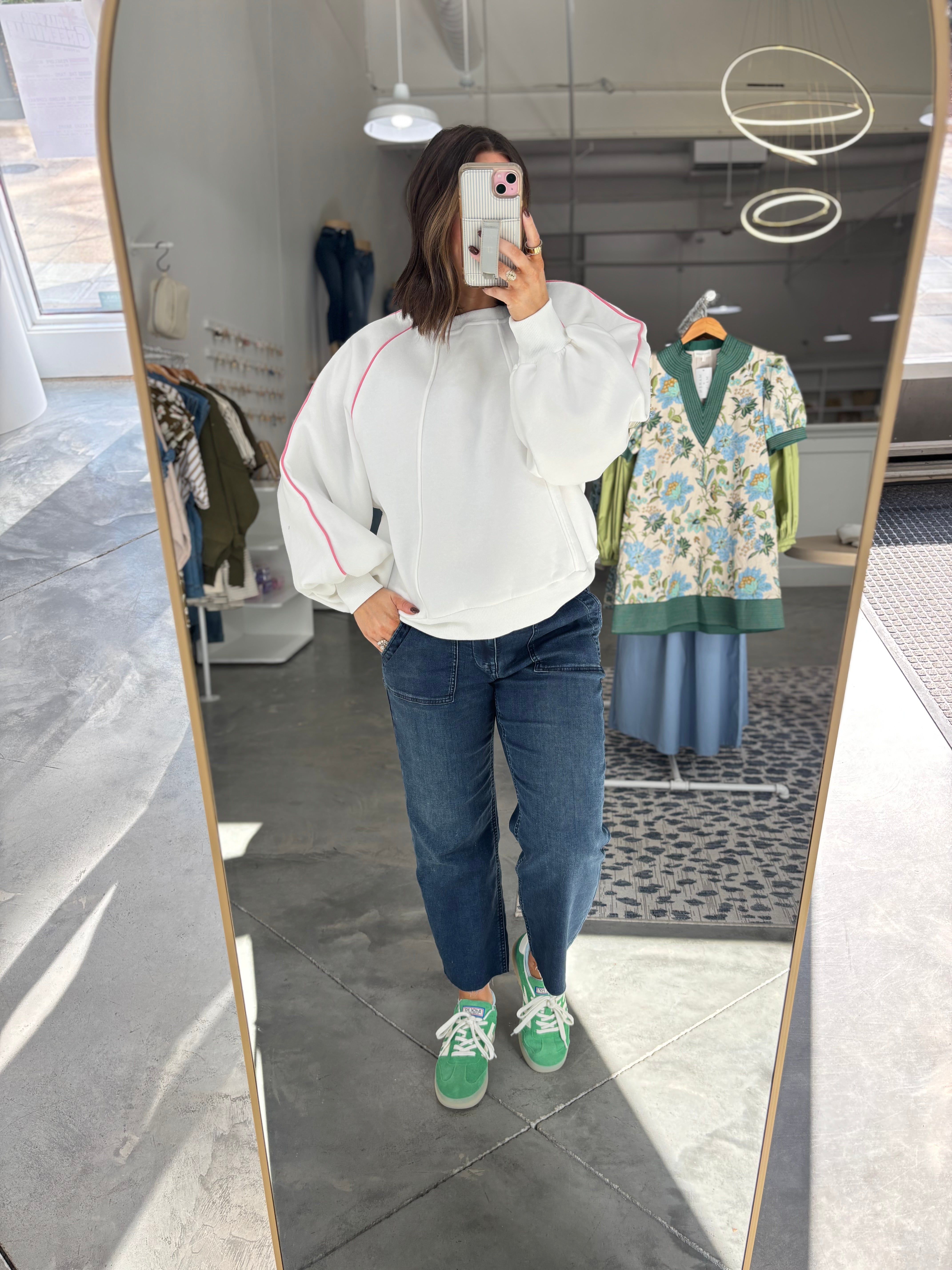 Classic meets playful in our A Pop Of Pink Crewneck Sweatshirt. Its soft feel and chic detailing make it an easy favorite for everyday wear!