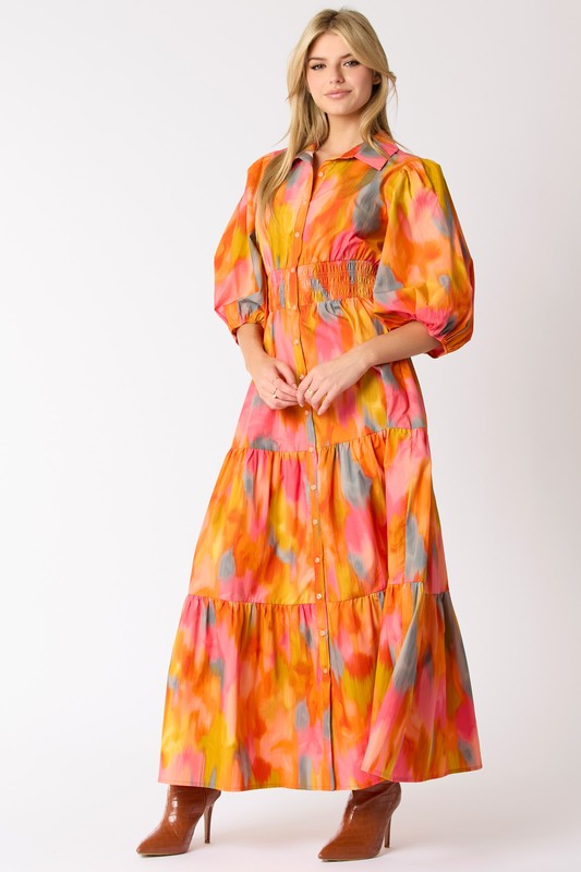 Feel beautiful at all times in our Autumn Sunset Maxi Dress. It features a collared v-neckline, full buttons down the front, 3/4 elastic puff sleeves, smocked waistline, allover painted print, tiered skirt, relaxed fit, and straight hem.