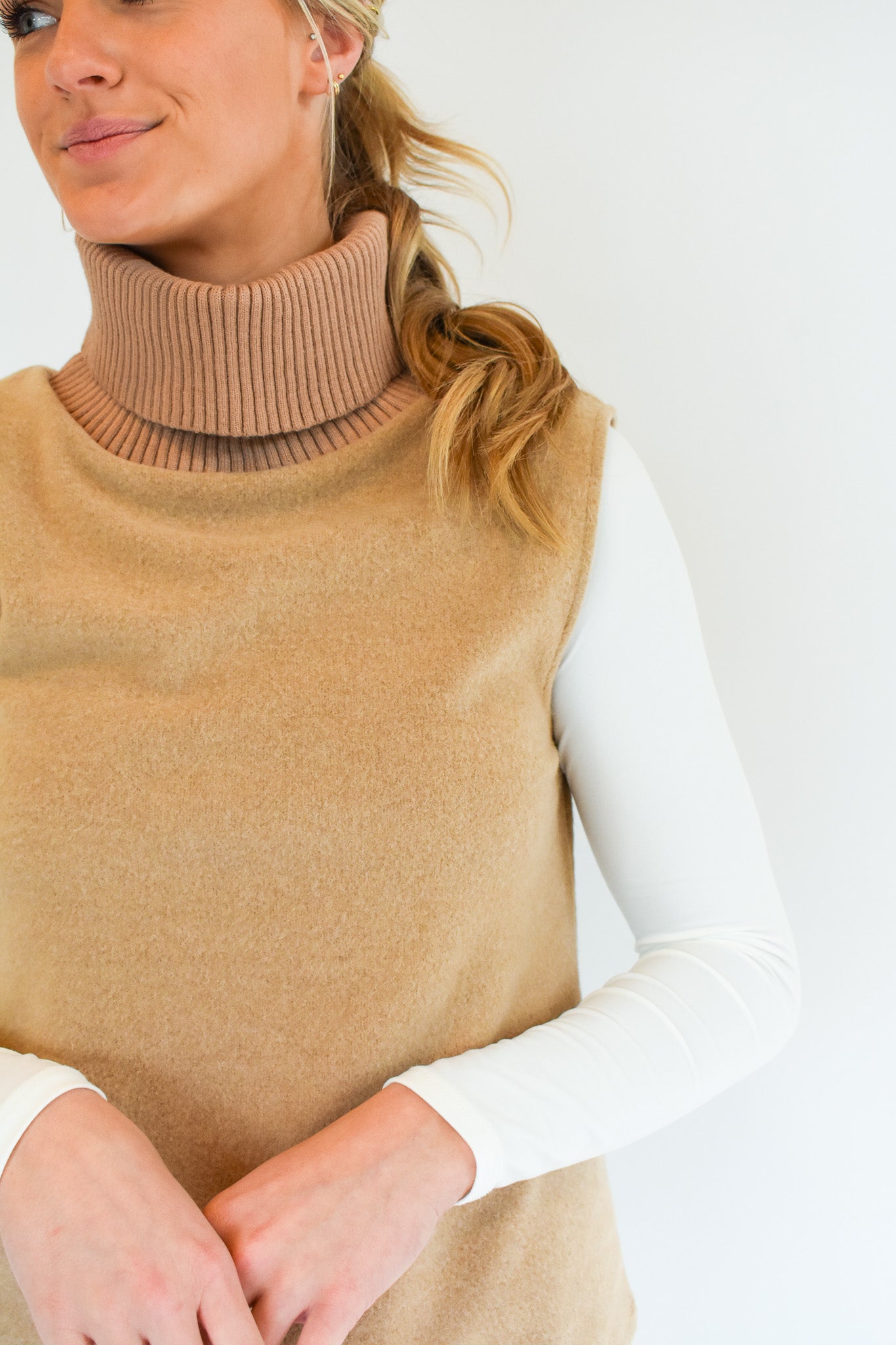 Soft isn't even the word to describe this cutie... Our On Taupe of the World Sweater Tank features a ribbed turtleneck neckline, sleeveless construction, allover knit fabrication, relaxed fit, and straight hem.