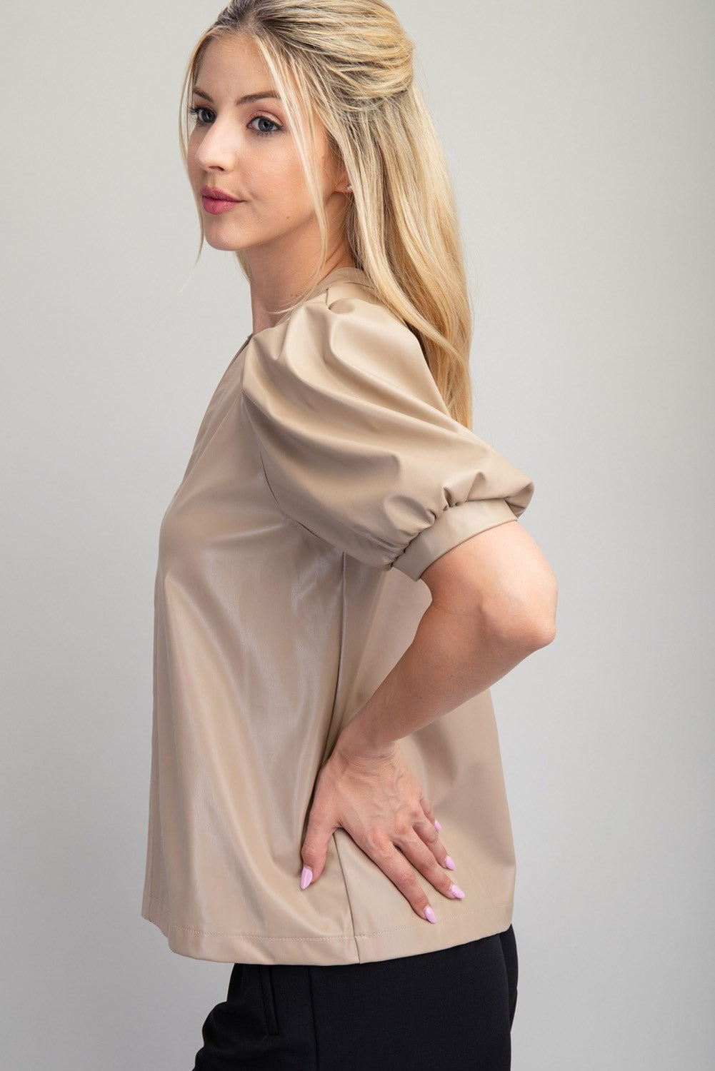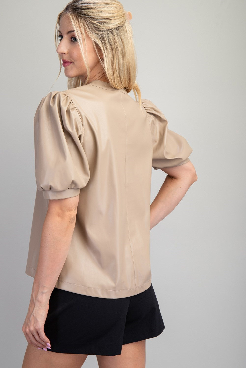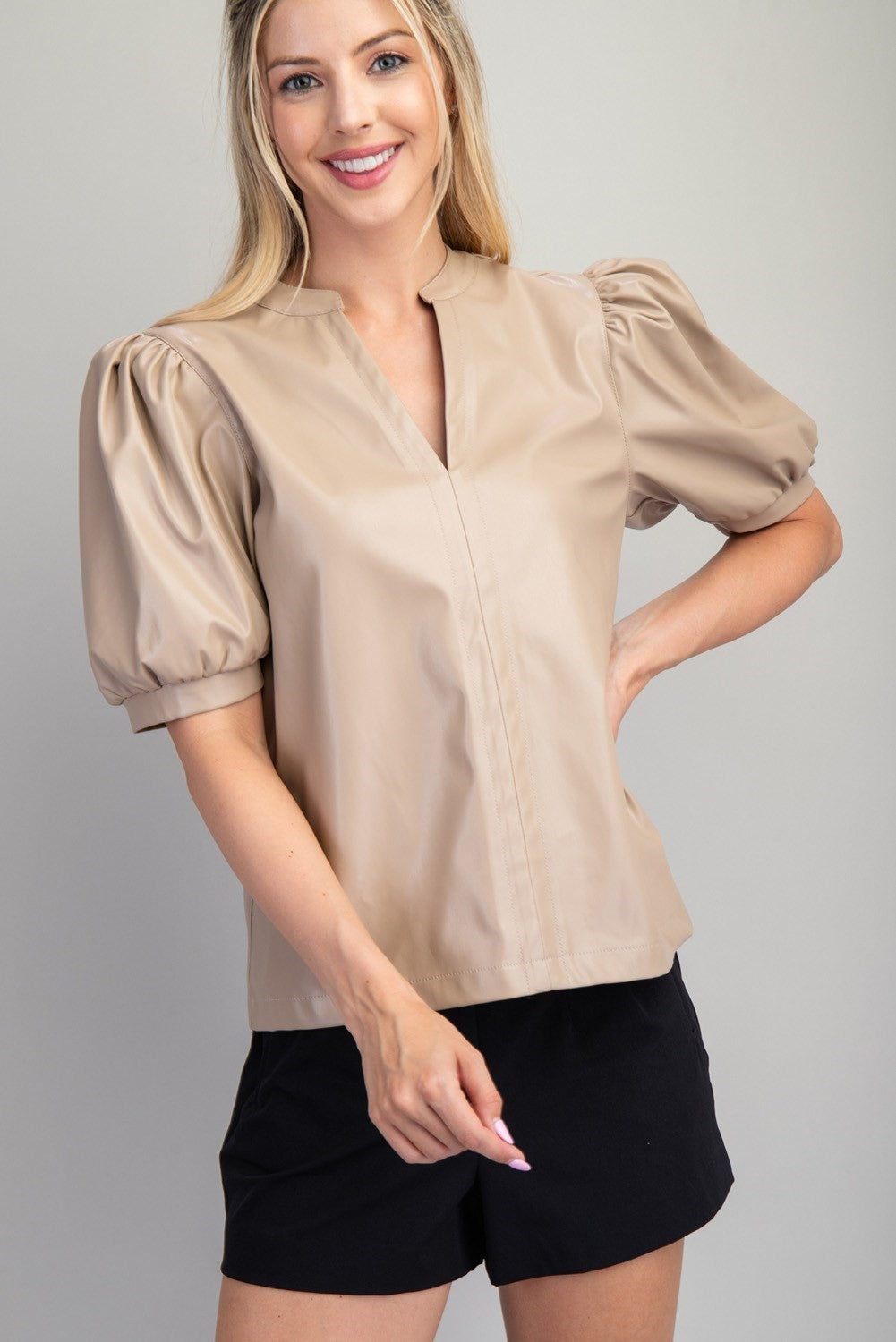 Our I Love You A Latte Top offers a little bit of sass with a whole lot of class! It features a split neckline, short puff sleeves with banded cuffs, relaxed fit, and straight hem.
