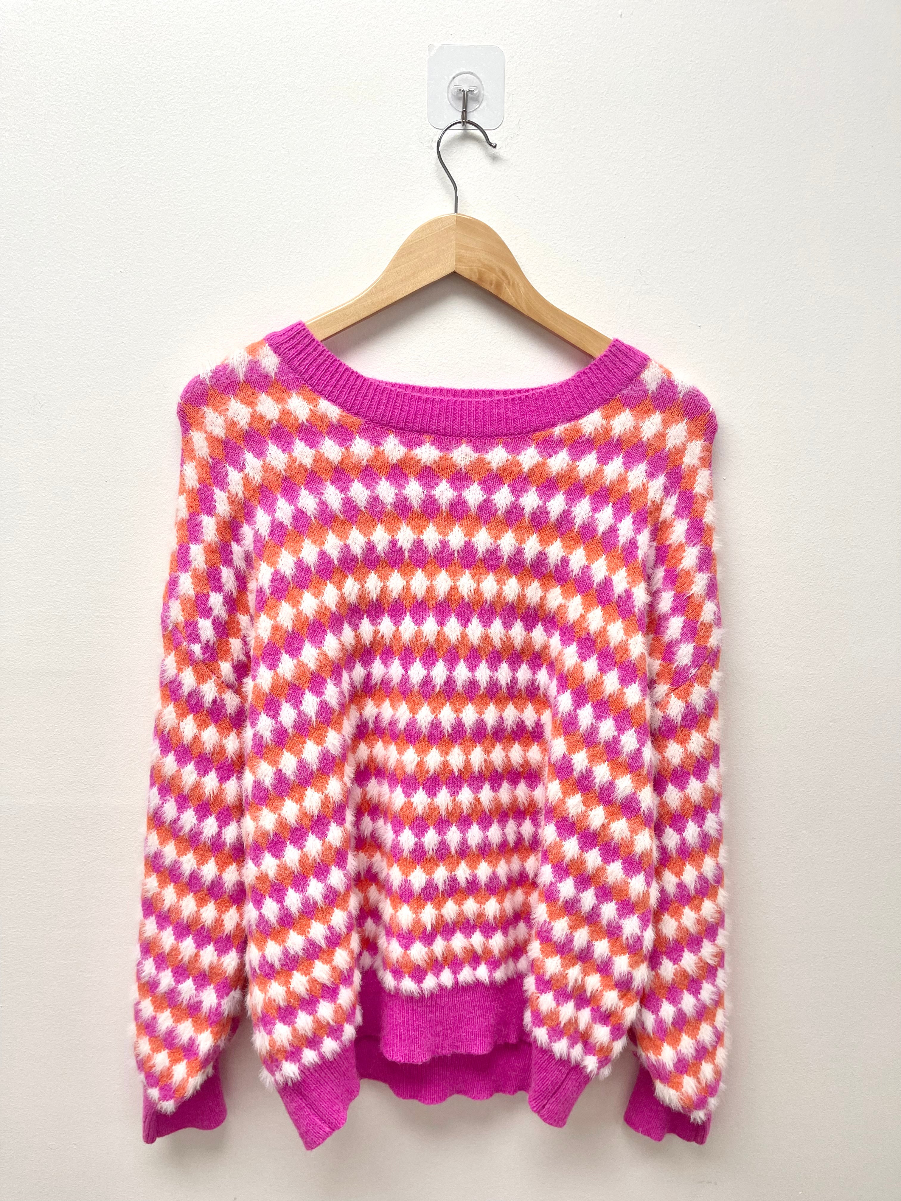 Our Delightful Diamond Pattern Fuzzy Sweater is a must have style!