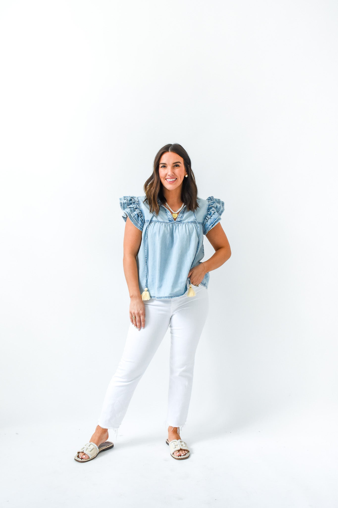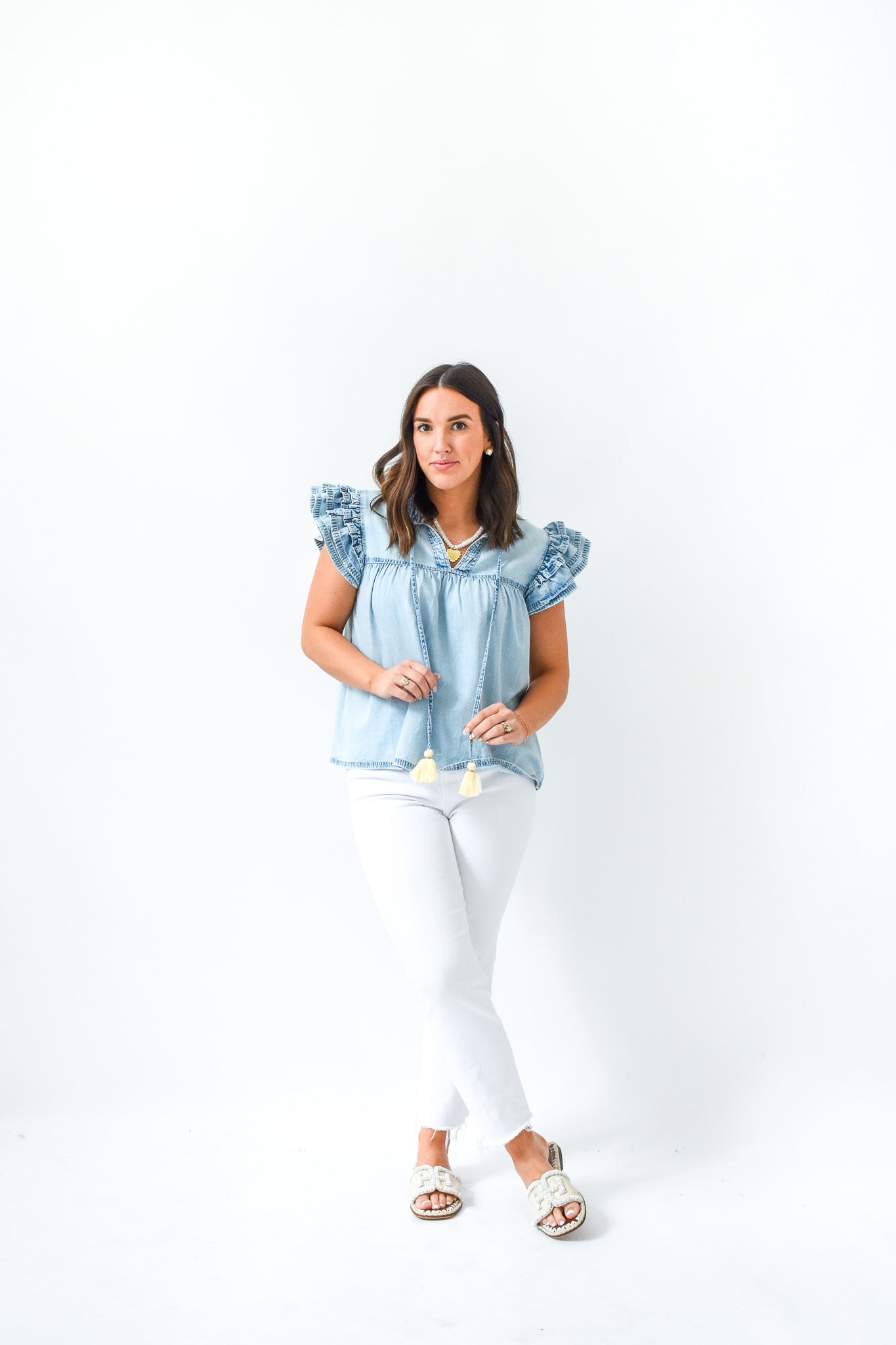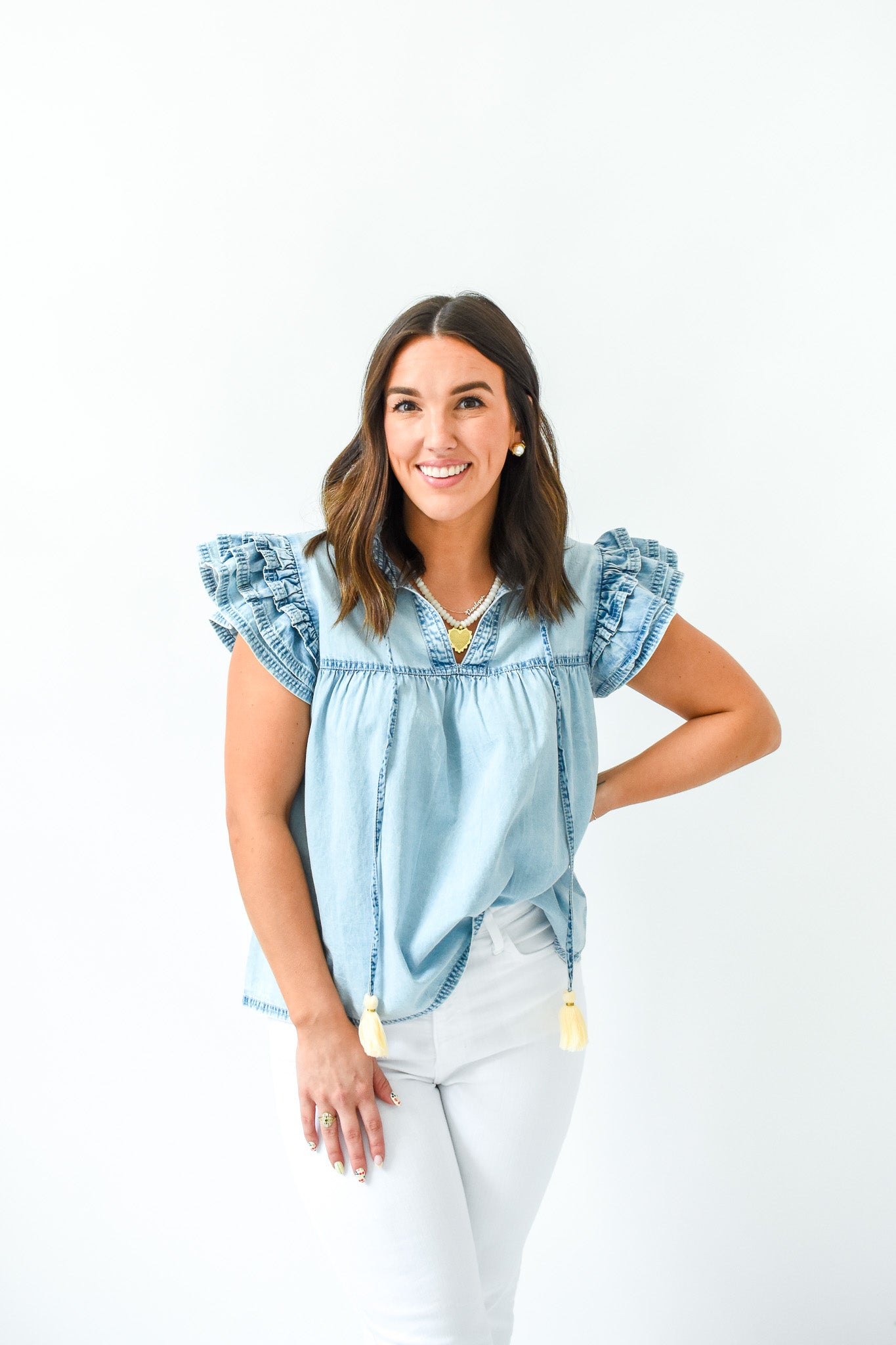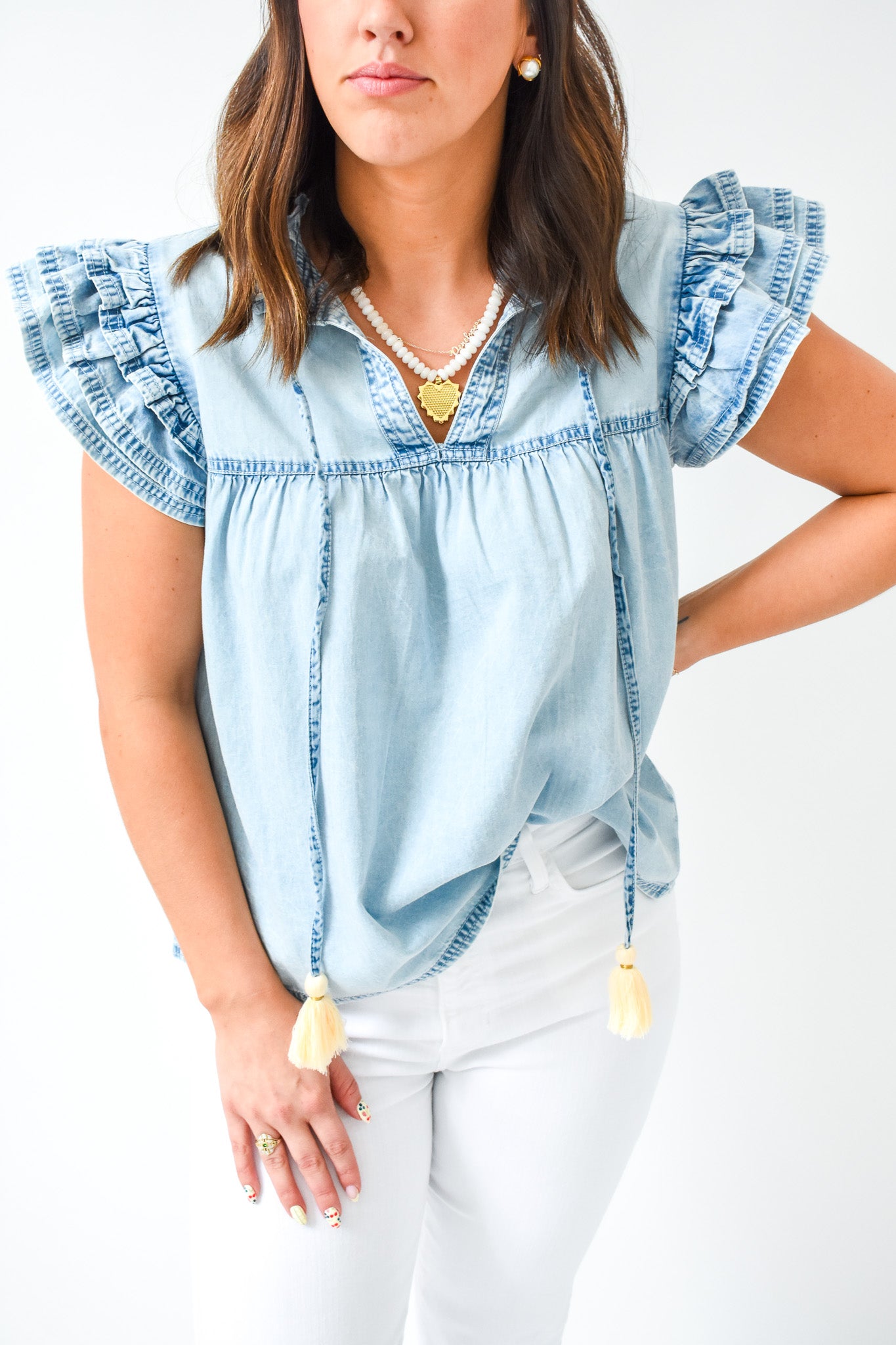 Our Denim Delight Tassel Tie Top is a must have for fall! It features a v-neckline with tassel tie and ruffle detail, layered ruffle sleeves, relaxed fit, and straight hem.