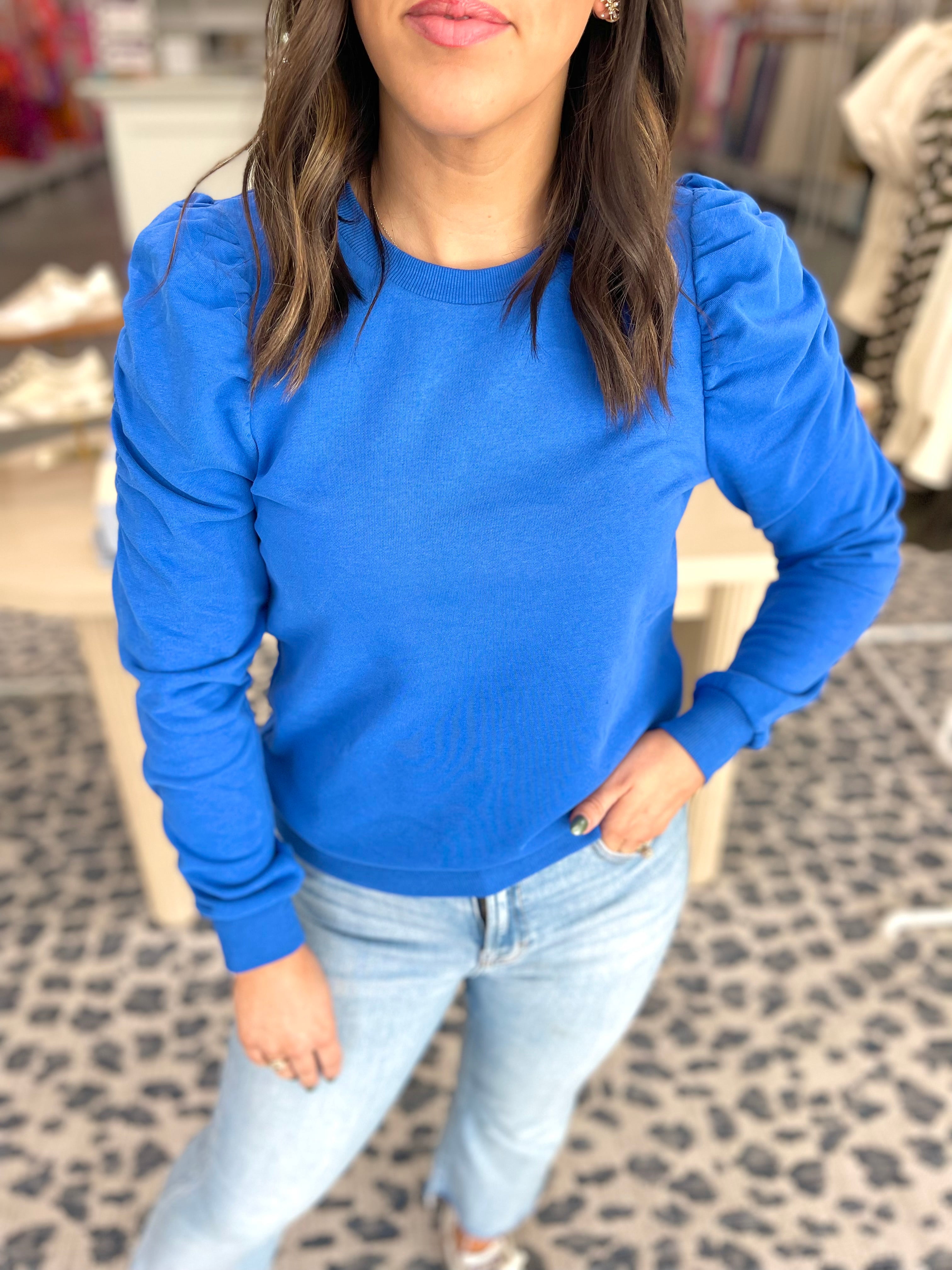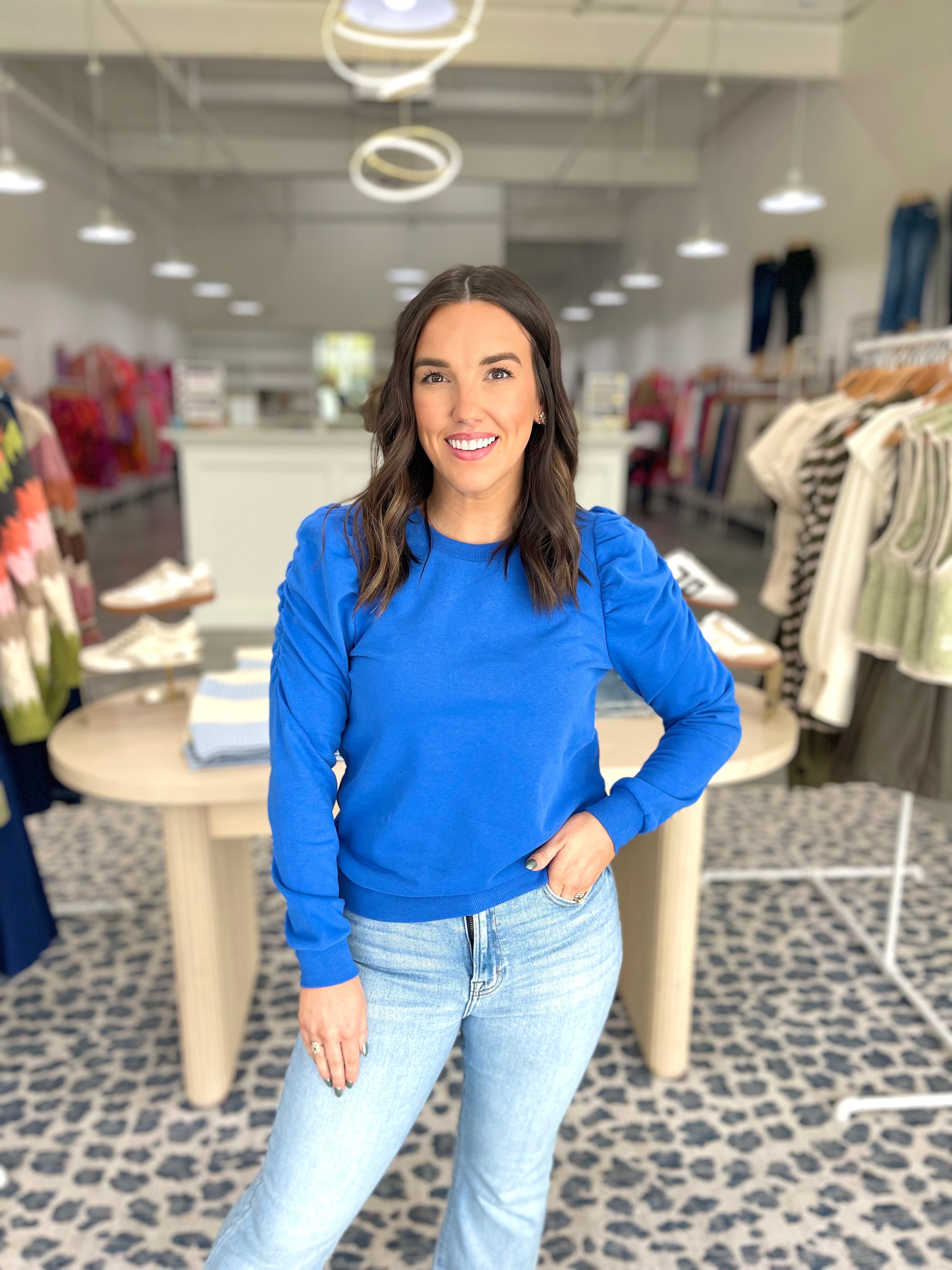 Our In A Ruche Knit Top is a top you will want to wear everyday. It features a round ribbed neckline, long ruched sleeves with ribbed cuffs, relaxed fit, and ribbed cuff hem.