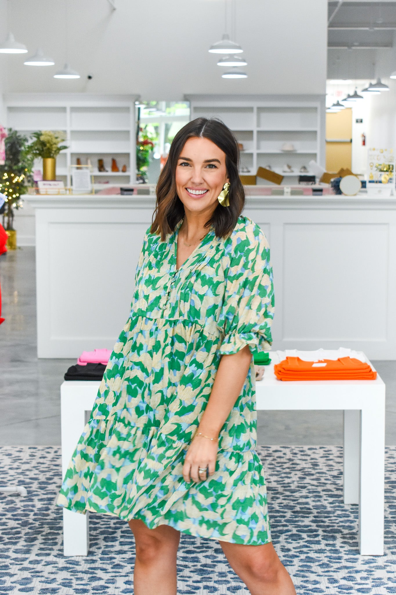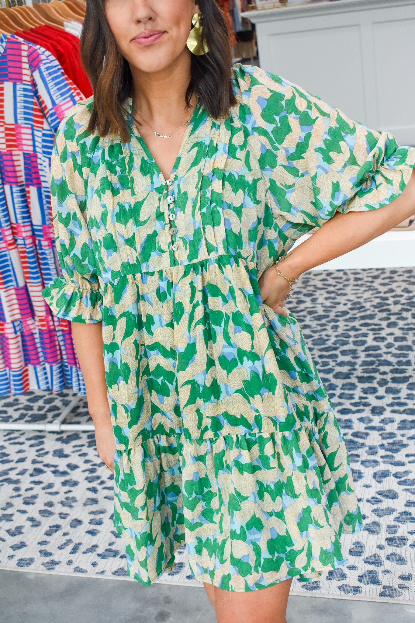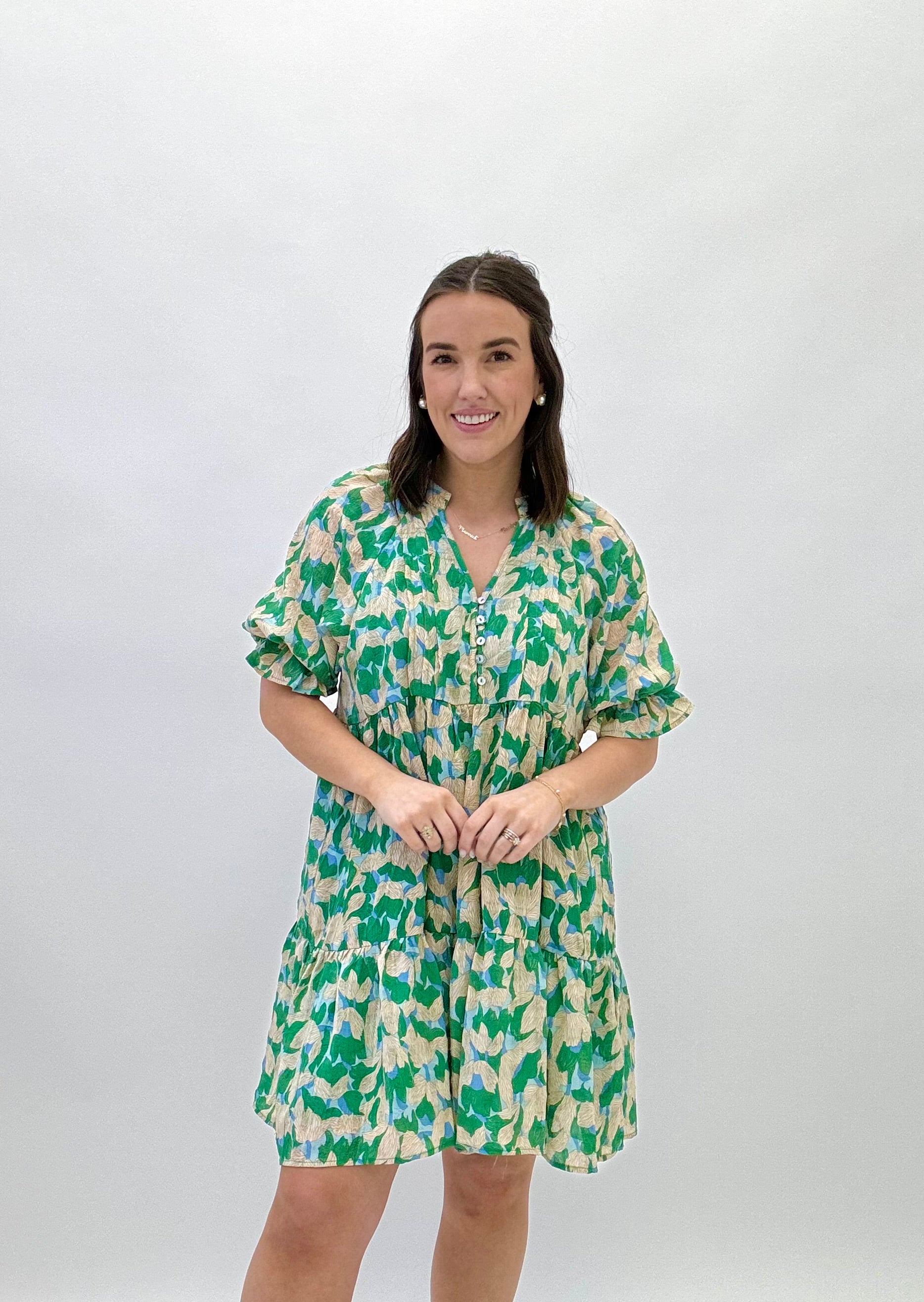 What's not to love about our Making Waves Dress?! It features a v-neckline with button placket, sheer short with elastic cuffs, seamed waistline, classic babydoll silhouette, and a ruffled straight hem.