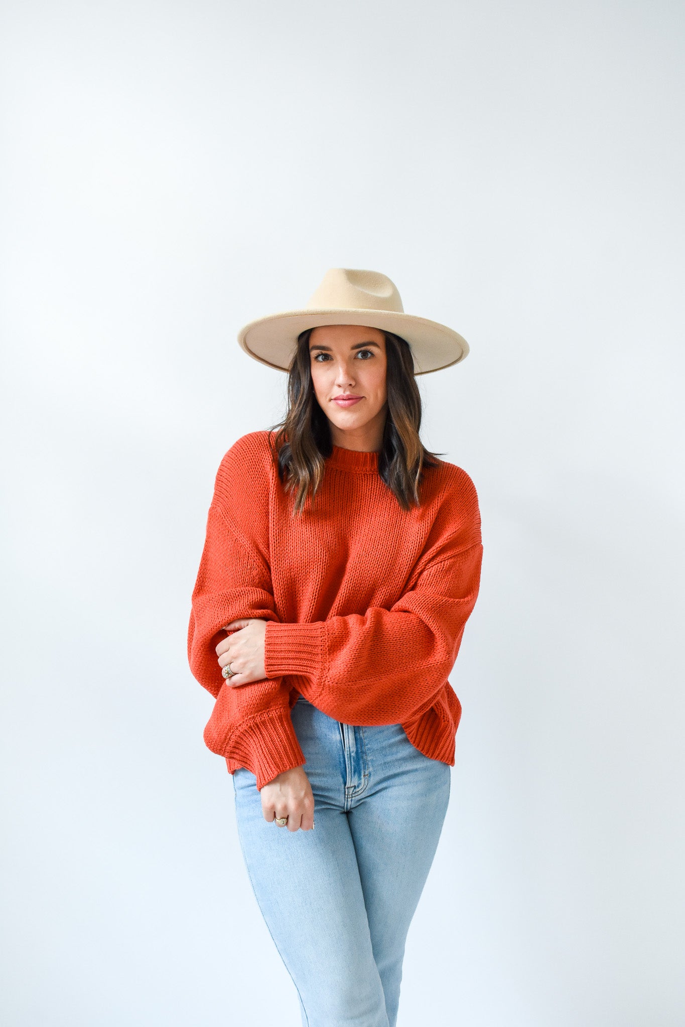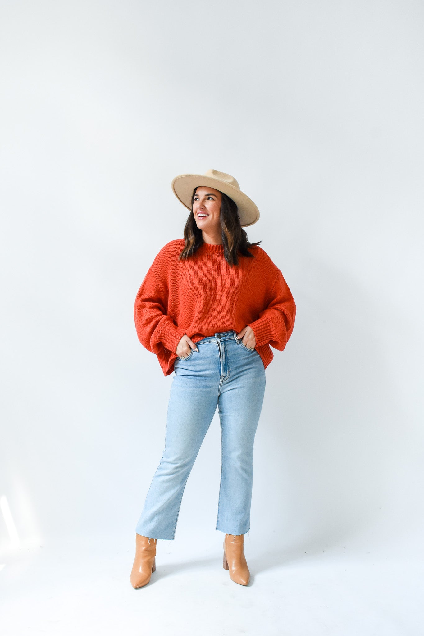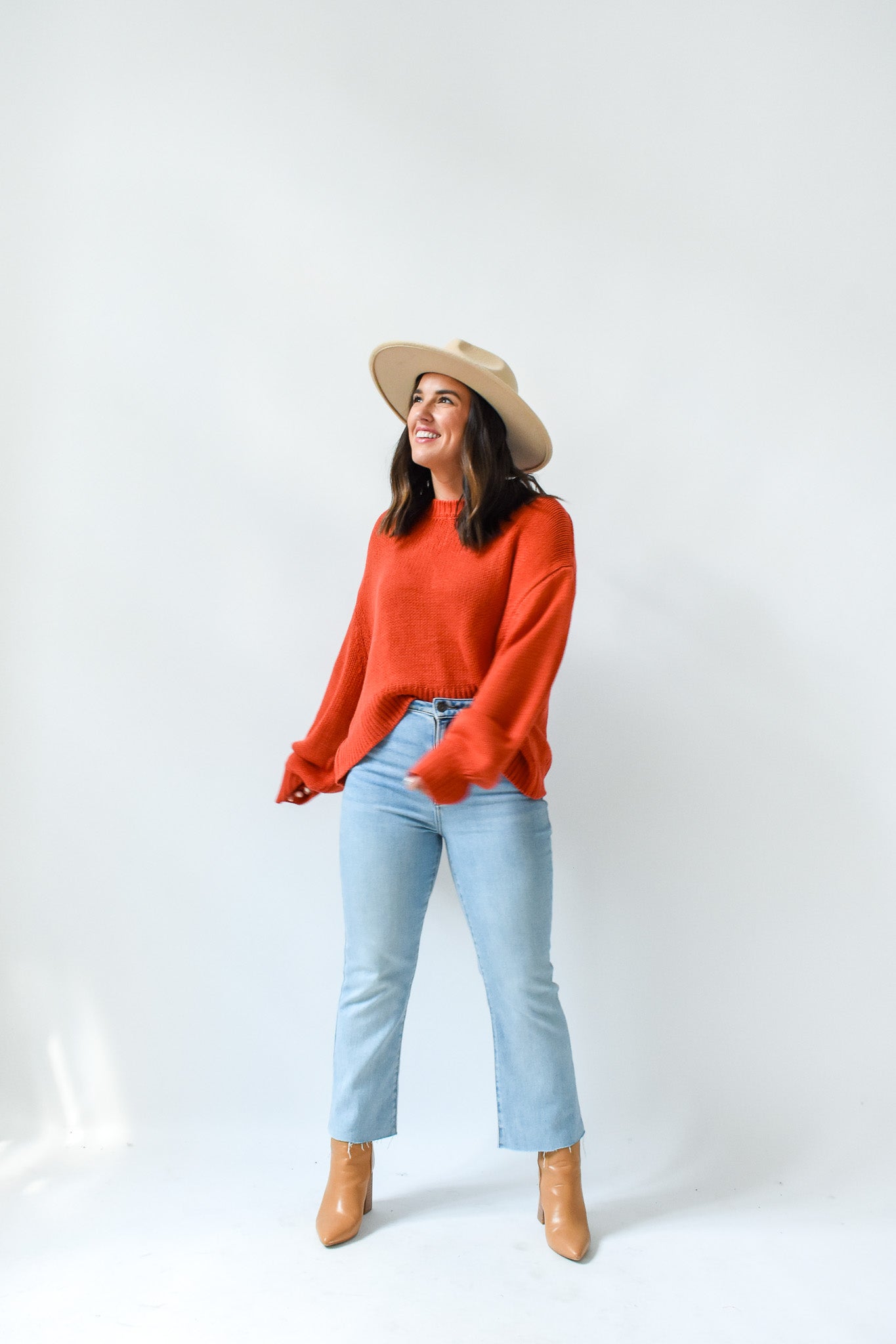 Get ready for cooler weather in our Orange You Glad It's Sweater Weather Top. It features a ribbed neckline, balloon sleeve with ribbed cuffed, oversized fit, and a ribbed hemline.