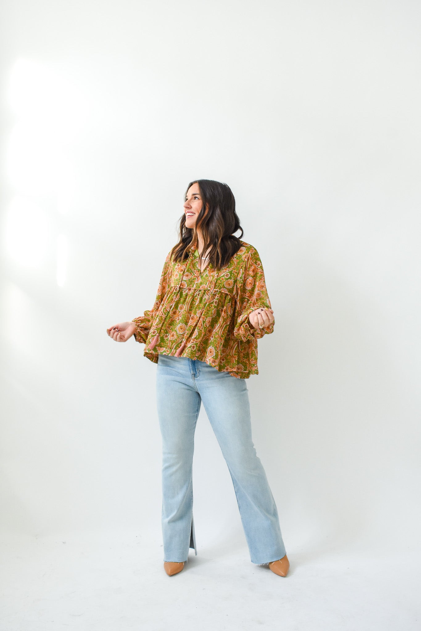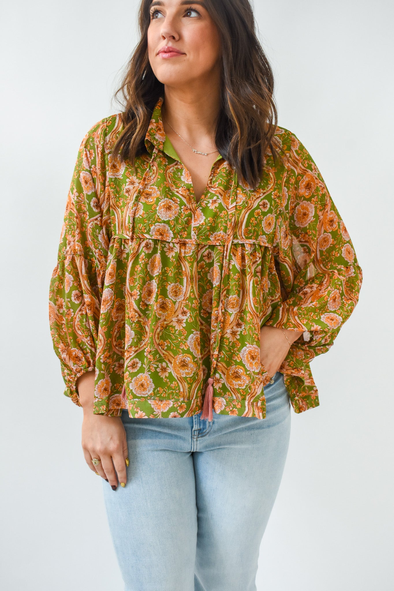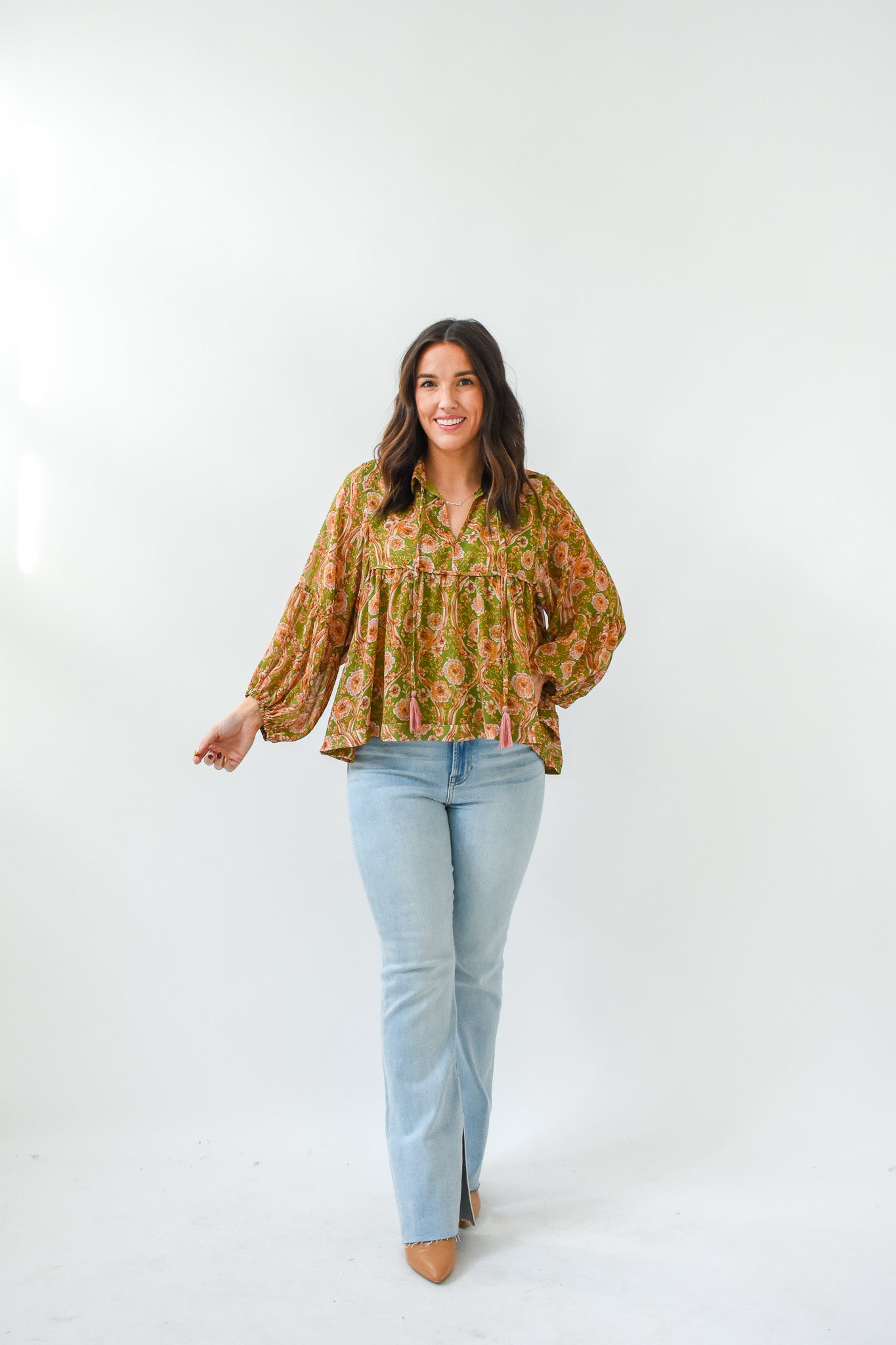 Our Petal Pushers Floral Babydoll Top is the perfect print and the perfect style! It features a collared v-neckline with tying tassel detail, long puff sleeves with elastic cuffs, babydoll seam bodice, relaxed fit, and straight hem.