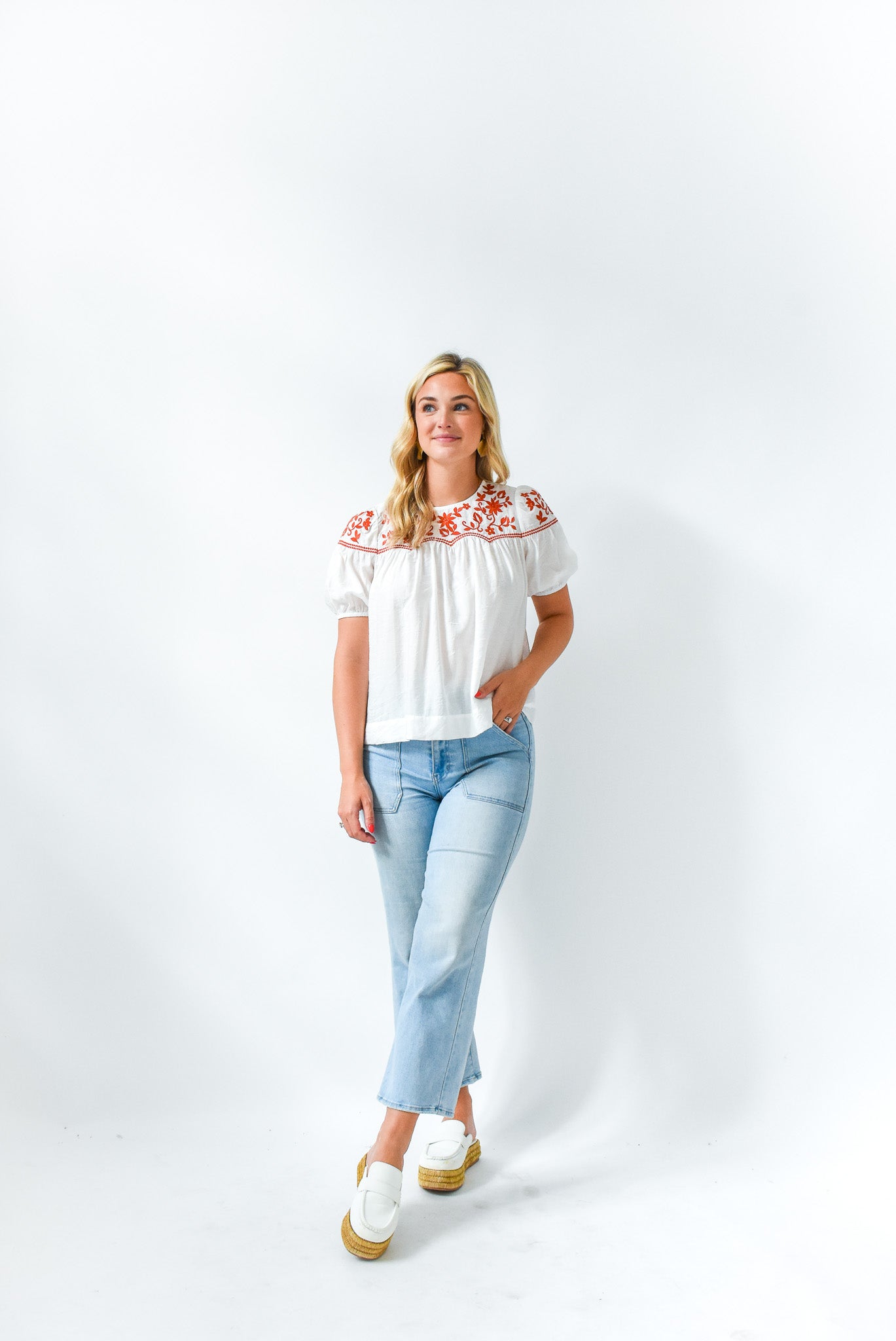 A cute top that is perfect for everyone! Our Seams Legit Embroidered Top features a round neckline, short sleeves with elastic cuffs, embroidery detail, relaxed fit, and straight hem.
