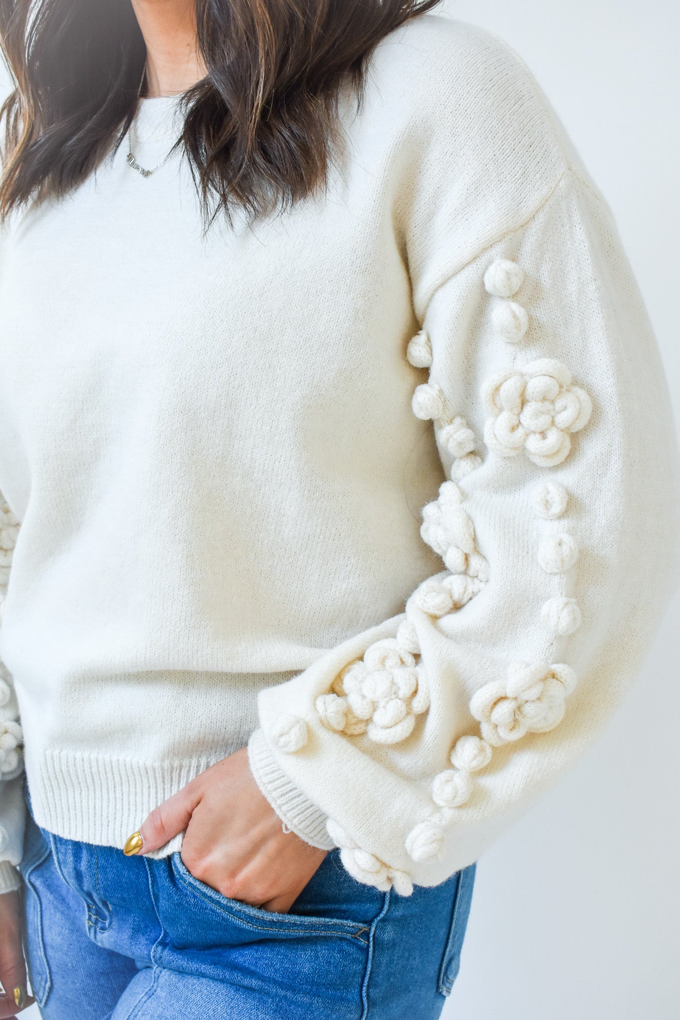 Our Sleeve It To Me Sweater is the perfect elevated basic you closet needs. It features a rounded ribbed neckline, chunky embroidery detail on the sleeve, relaxed fit, balloon sleeves, and straight hem.