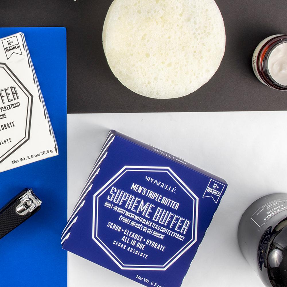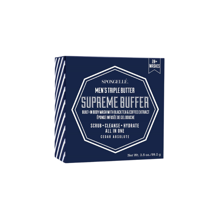 The Men's Supreme Buffer has a moisture boosting triple butter body wash built-in that will forever change his shower experience. Formulated with moisturizing cocoa butter, nourishing shea butter, and vitamin A enriched mango butter.