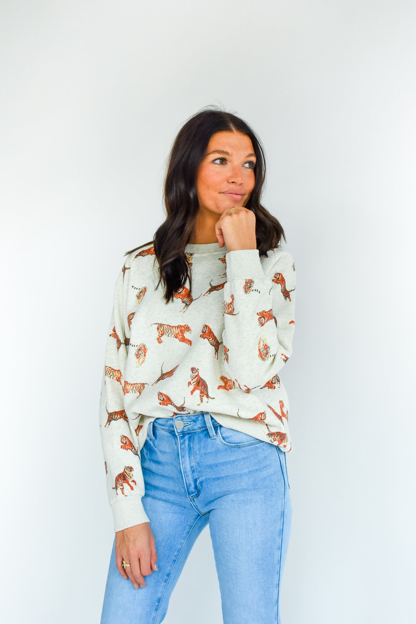 We are ALL about a fun sweatshirt that is cute and cozy! Our That's Grrrr-eat Tiger Print Sweatshirt features a round neckline, long sleeves with ribbed cuffs, tiger print graphics on front, relaxed fit, and straight fitted hem.