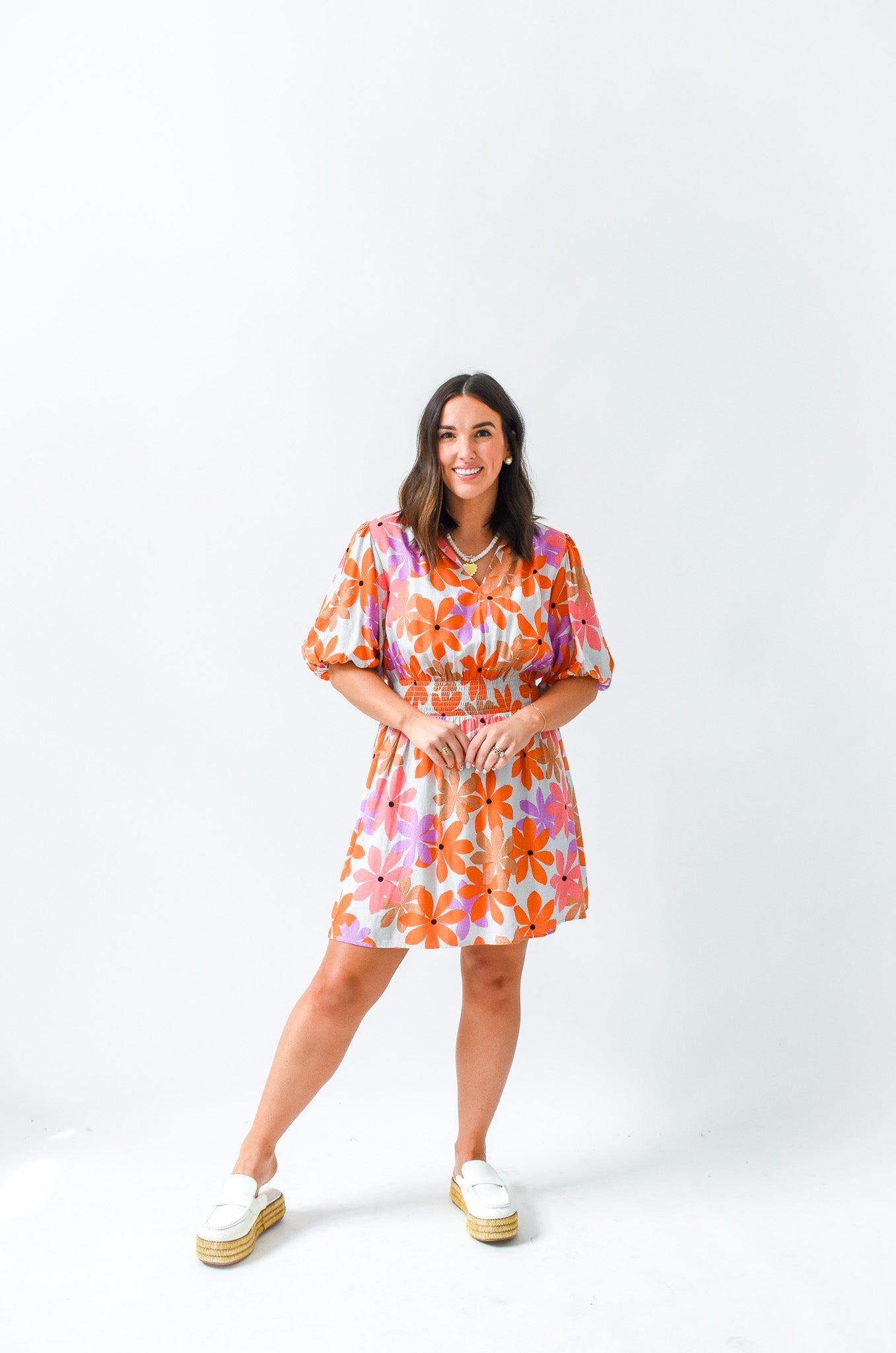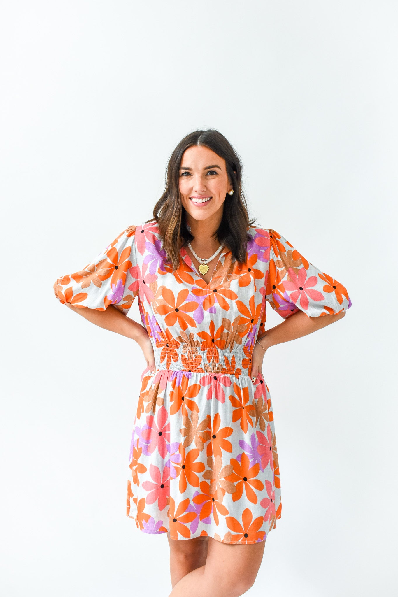 The Bloomin' Best Flower Print Dress is a must have for all of our girlies! It features a v-neckline with ruffle detail, short sleeves with elastic cuffs, smocked waistline, allover flower print, relaxed fit, and straight hem.